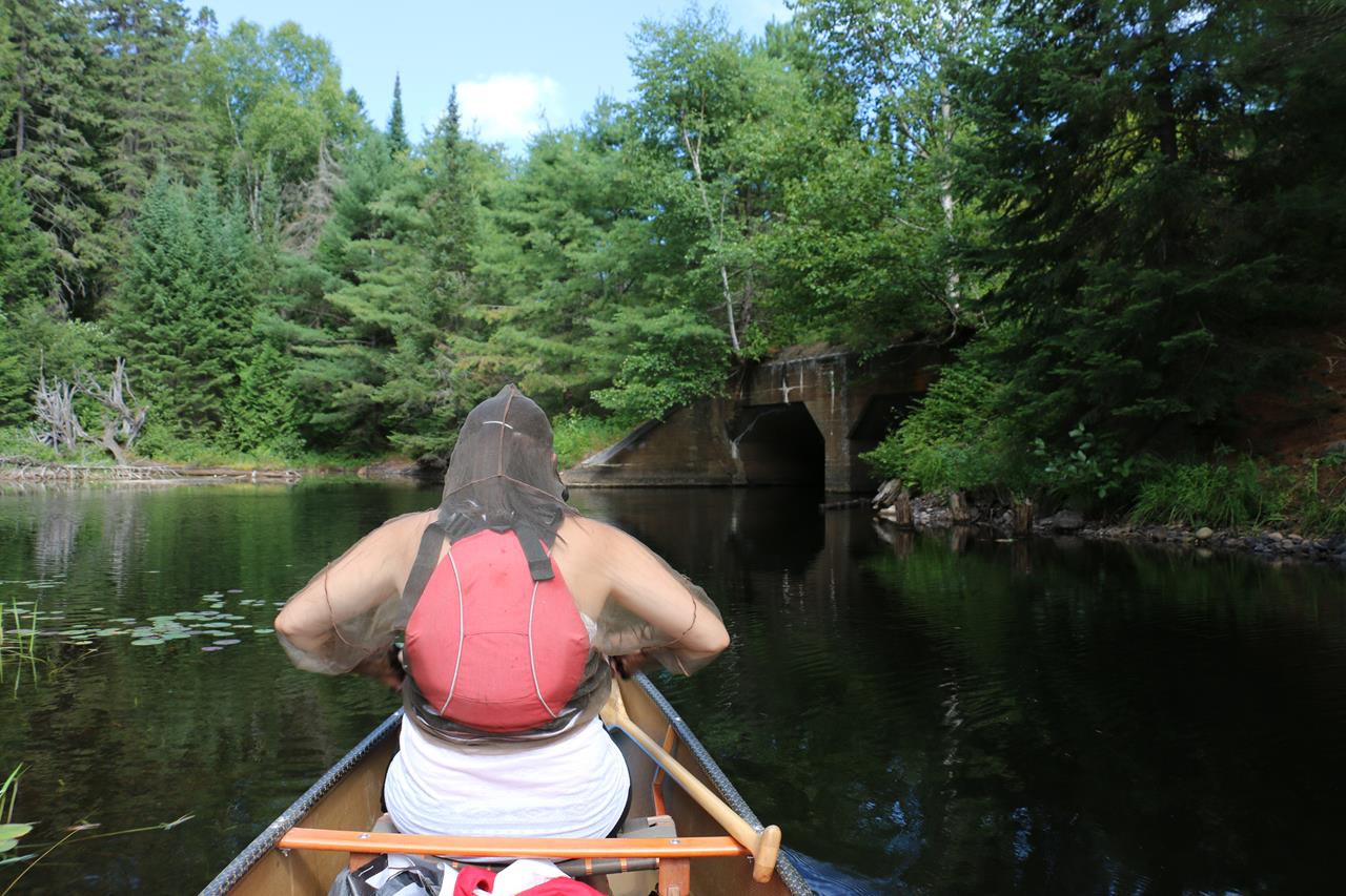 After a solid 45 minutes at the ruin site, we figured we photographed and absorbed as much as we could and decided it was time to move on. Our day is mostly paddling with only two very short portages. Knowing this, we decided to bring in a little extra wine and food for the first night. Continuing up Cedar Lake and eventually through Little Cedar Lake, I mentioned to Angela how happy I was that the wind was cooperating – it was still a very calm day. As we arrived at the narrow channel leading to Aura Lee Lake Angela became very nervous. She has difficulty seeing under water (I need to get her some polarized glasses) and she was worried we may hit a rock. Now if you’ve been through this area, you know hitting a rock here isn’t as simple as hitting a rock somewhere else – these are some extremely jagged and sharp rocks, hitting one would surely damage the gel coat. I told her not to worry and just keep a close eye – but before I could finish saying that I hear ‘cruuuuunch’ and we were stuck. Oh well, it’s happened, lets deal with it a move on. I stepped outside the boat to ease the weight off the rock and moved it into the deeper part of the channel, then climbed back in. No worries, it happens! We made our way down the narrow channel and arrived at the railway underpass. Being terrified of spiders and other creepy-crawlies, Angela threw on her bug jacket and ducked down while I paddled through the dark and narrow tunnel. A huge sigh of relief was heard from the front of the canoe once we were on the other side– and rightfully so, as there were some pretty big spiders on the wall in that tunnel!