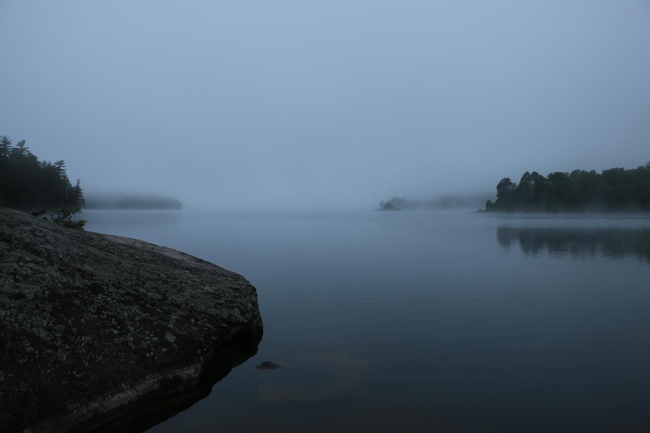 6:05am and I am out of the tent. I try not sleep in while out in Algonquin – the early hours of the morning are my favorite. Everything is still so quite and the forest is just beginning to come alive with the songs of many birds. This morning was a little more special than others, it was very foggy out and it must have rained hard throughout the night. I grabbed my camera and began to take photos up and down the lake. It was such a beautiful morning. I untied the food from the tree and set up my stove away from the tent, as to not wake Angela. With water in the pot and the pot on the stove, I was eagerly awaiting my first cup of coffee. I may have had a little more wine than I should have the night before – but I had too – I didn’t want to carry it across 6 portages today. With the water boiled I made a coffee, grabbed my chair and sat down next to the shore. Just looking around and across the lake, enjoying the view and the silence. It had that August feel to it, cool dewy mornings and it felt like it could be a hot day. I relaxed by the lake for about an hour enjoying two cups of coffee while there. About an hour and a half after I woke up, Angela emerged from the tent. She was trying out a new sleeping pad and slept very well. Good thing too, because we will be travelling nearly 27 km today with 6 portages totalling over 5600m. A tough day indeed!