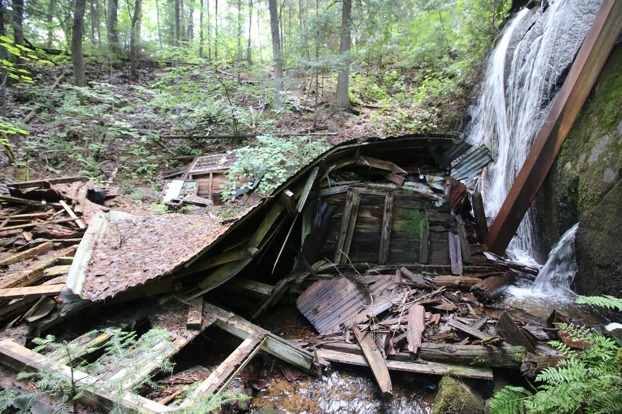 The wind was picking up and I wanted to get going, as we would be facing the wind for about 10km while paddling to the upper end of Cauchon Lake. We paddled over to the start of the portage to Windermere Creek and started to explore. While Angela followed the portage trail proper, I followed the creek. I could hear the sound of water falling and this fit the bill for what I was looking for. Apparently there used to be some type of power generating facility here that used the water falling over the rocks to turn a waterwheel connected to a turbine. How cool would that be to find out here? I followed the sound of the water and a very faint trail to one of the most scenic water falls in Algonquin Park. It’s not huge, or have massive volumes of water flowing over it, but it’s tucked away in a little hollow of land which creates a bit of an echo. Arriving at the ruin site, I immediately knew I was looking at the right place, even though the entire structure had collapsed. There was evidence of power generating equipment here, along with tools, structures and even an in-tact glass window in one of the collapsed walls. I called out to Angela to see it. She came over and was equally impressed. We both photographed the area and the waterfalls then just sat back for a while and took it all in.