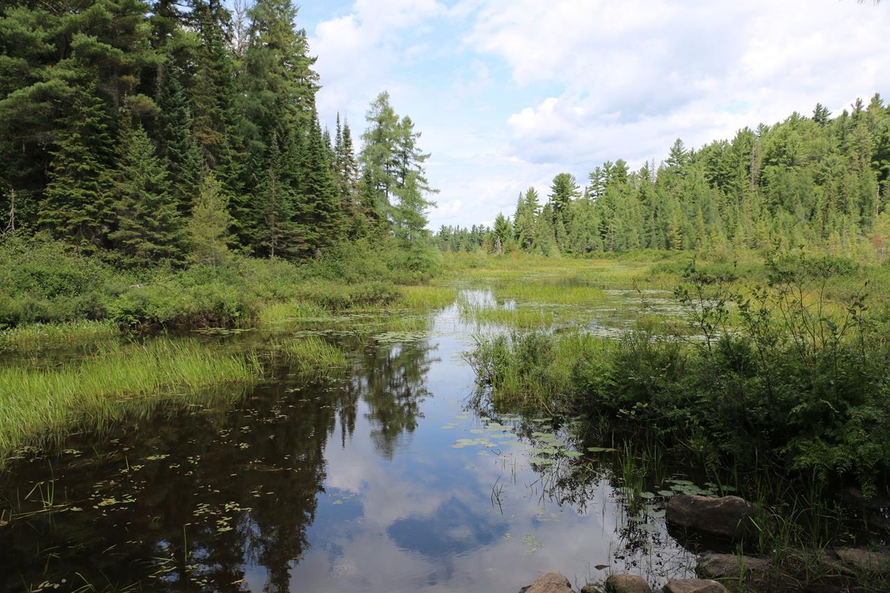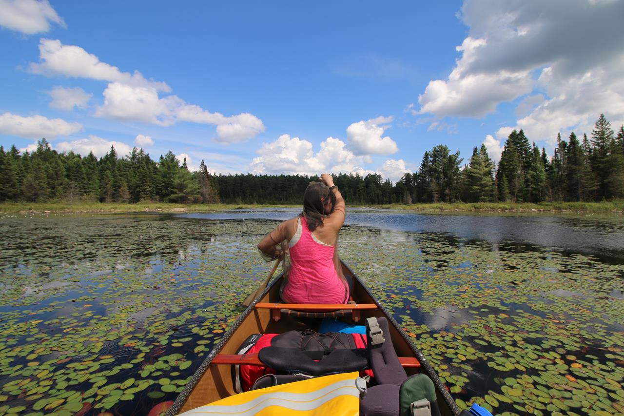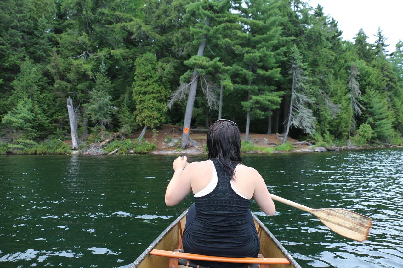 It was 4pm and we were halfway down Osler Lake when I heard some thunder. I looked around and still saw no lightning so decided to continue to the portage to Nadine. I prefer to be in the forest during a storm anyway. We paddled for about 10 minutes or so and eventually made it to the last portage of the day, which also happens to be the longest portage of the trip. We were both pretty tired and not looking forward to this near 2-km crossing. Sluggishly and as if in slow motion we loaded up and began the walk through the forest. Just as it happened yesterday on our last portage of the day, the rain started up. It wasn’t a heavy storm, but it was raining none the less. So far it has rained each day of our trip, but it hasn’t put a damper (ha!) on it because the storms have been short and intense, so kind of enjoyable. It was a little hot out anyway so I wasn’t too worried about getting wet. We crossed about 500m of the trail and took a break at the first canoe rest. The rain continued and so did we. About another 500m into the trail I shouted back to Angela to keep her eyes peeled for a freshwater spring on the side of the trail. Not five seconds after saying that we came to a boardwalk and just to the right I could see a black pipe – I found the spring! I put the canoe down and waited for Angela to catch up. We took advantage of stopping and dropped our loads to take a full out break. I filled my water bottle with the sweet spring water, chugged it mostly down and filled it again. The water was freezing cold to the point where it left condensation on the outer side of the Nalgene. We both enjoyed fresh water and it was almost as if it gave us a second wind. I grabbed my pack and the canoe, and Angela geared up too. We hit the trail and continued for about ten minutes without stopping until we reached Nadine Lake. The rain had let off during the final leg of our portage but my feet and pants were wet anyway so I just walked right into the lake to place the canoe down.