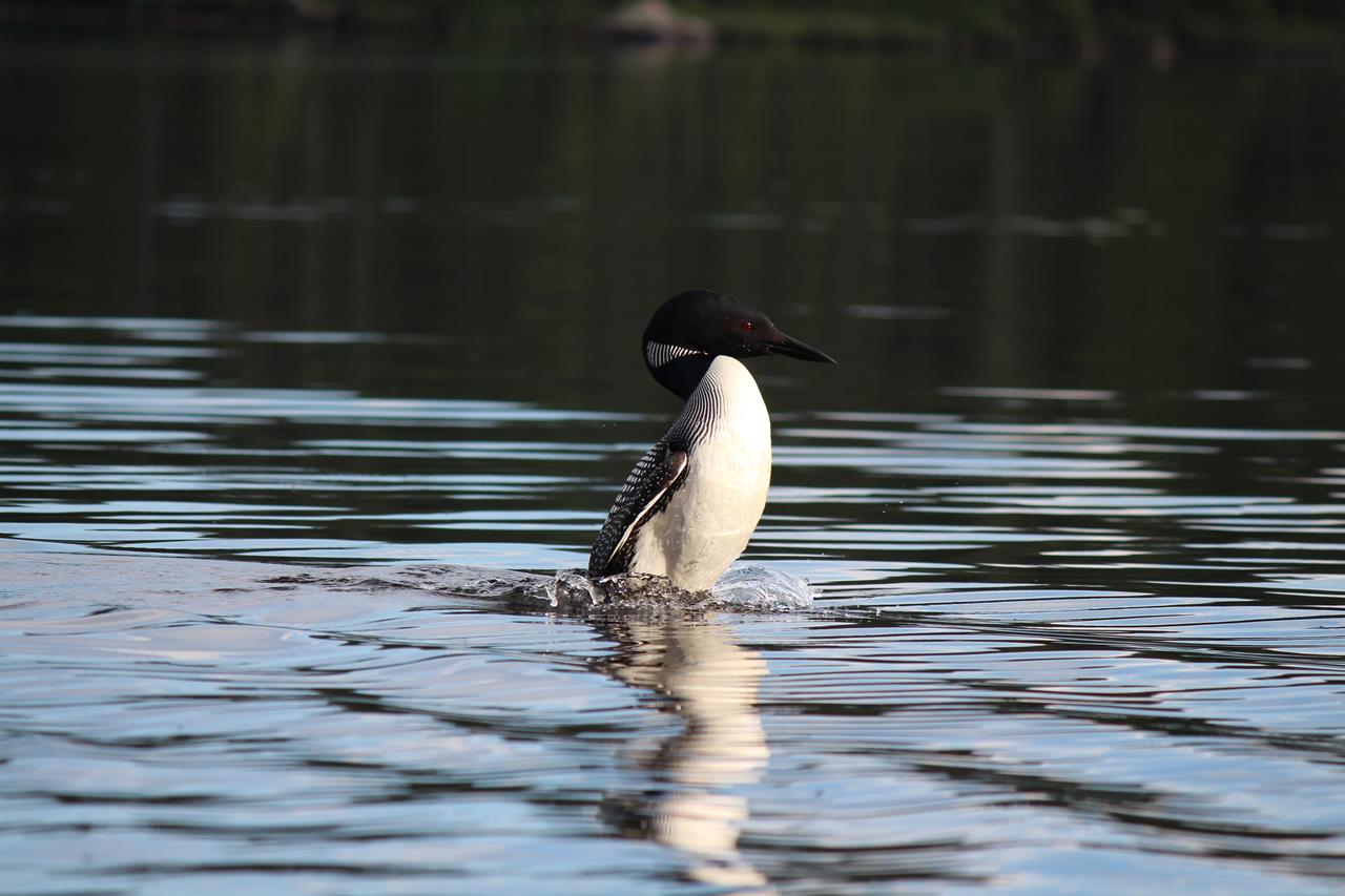 I paddled quickly but quietly and we were within about 30 feet of the parents. My goal was to paddle by quickly, releasing the bird as soon as we’re parallel to the parents then continuing on and out of there quickly. The plan was in motion; I was moving at a good pace when suddenly one of the parents went under. ‘Get ready’ I whispered to Angela. ‘Now!’ I said a few seconds later. With that, she gently released the chick over the edge of the canoe and into the water, and then the other parent went under. ‘Shit!’ I said, but continued to paddle quickly as to vacate the area. ‘Where are they? Where are they??’ Angela asked. Then, just at that moment they popped up. The chick was still peeping away and the plan worked, he was blown closer to them. Within seconds they were reunited. It was the most beautiful thing I’ve ever seen in Algonquin. Minutes ago I’m sure these birds had assumed their young was dead and gone, heck even I was convinced of the same – but here they are, alive and well. For about 5 minutes I didn’t paddle or speak, nor did Angela. We just watched. It almost sounds made up but the loon family literally swam off down the bay into the sunset-lit water. Like I said, it was the most beautiful experience I’ve had in Algonquin.