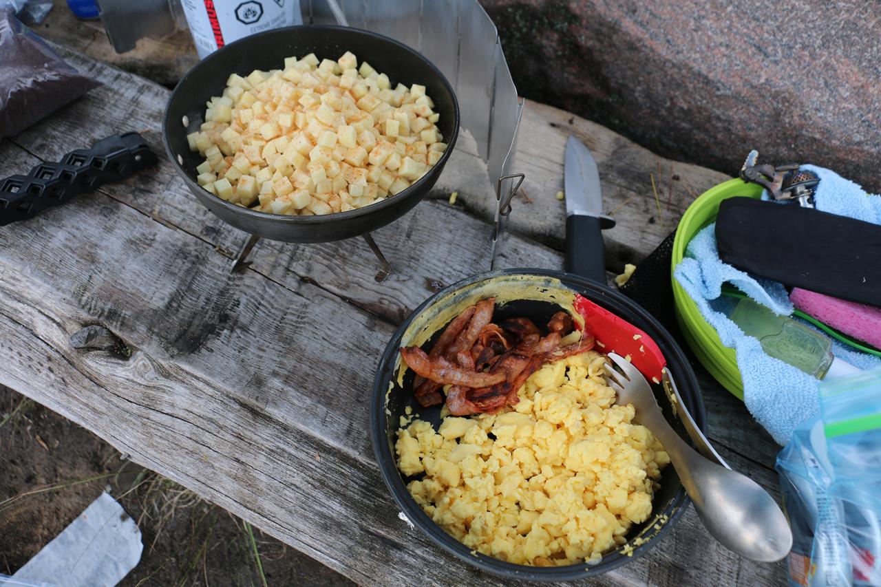 Remember when I said I never sleep in while in Algonquin Park? I lied. I stayed in bed until 9:30am and loved every minute of it. I slept so well last night, and I had the pleasure of not having to wake up and use the bathroom half way through the night! I crawled out of my sleeping bag and out of the tent. I looked up and was happy to see a mix of sun and cloud, none of which looked like rain clouds so that’s always nice. I retrieved the food and setup the stove with some water for coffee. Angela was awake and packing up the inside of the tent. I’m really happy with how she is adjusting to moving each day, it’s not so bad once you get a good routine going. Today was a short day in distance, only 12.6 km but half of that was portaging. We had a total of 7 portages today, one of them nicknamed ‘Heart Attack Hill’ and the last one being the longest of trip at 1830m. Today we had BLT’s and coffee for breakfast. I really love a good BLT and find two of them hits me just hard enough that I don’t need a big lunch. Angela finished with the inside of the tent so she came to the seating area to enjoy some coffee while I took the tent down. We were really getting into that nice routing I was speak of earlier. During breakfast we were reminiscing of our little adventure yesterday and we were both still very please with the outcome of the loon family. We took our time during breakfast and opted to have an extra cup of coffee. It was only 11am and following our intense day yesterday, we were in no rush today!