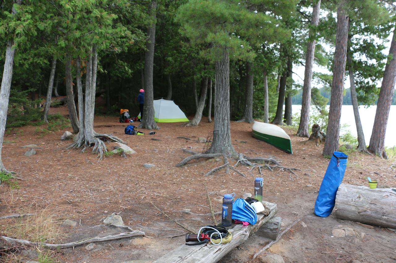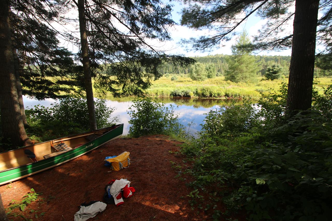We continued down the Nipissing through an area called ‘long marsh’. The name fits very well as this part of the river just snakes its way through a lush green marsh in the middle of a massive valley boarded by hardwoods and pines on high hills. I love this river – I love Algonquin. As we approached the section of river where Nadine Creek empties, there was a spot on the north shore I wanted to get out and poke around a bit. It had a ruins symbol on the map and it was an area where the edge of the forest and hard ground came right out to the river bank. As we passed it, I opted to save it for the next trip as we have 5 days on the Nipissing planned for next month. I took note of the shoreline and a little gravel beach I could park at to get out and explore. Next time for sure. We paddled for another hour through the quiet marsh, I was surprised we hadn’t seen any moose yet – this is prime moose territory. With a little over 5km to go, we decided to take a break on the river and have lunch. Once again, Angela threw together some salami and mustard on bagels and I thoroughly enjoyed it. As we sat in the canoe beached on tall grasses we could hear the calls of many birds in the forest. There was no wind so they could be heard very loud and clear. The sky was a little overcast but the sun managed to shine through, it was a beautiful day even despite the rain earlier. After lunch we continued down stream at a slow pace and keeping quiet with hopes to see a moose. No such luck and an hour later we came around the final bend in the river and I could see the orange campsite sign in the forest. We landed at the muddy bank and our travelling for the day was complete – in good time too as it was just passed 3:30pm.