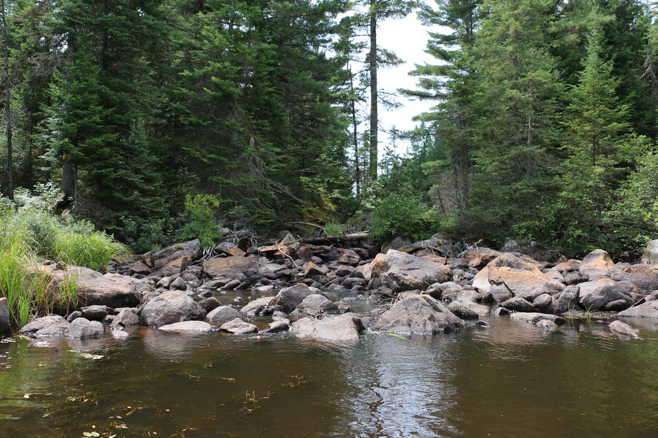 Now that the rain had subsided we began paddling across Nadine Lake towards the south, headed to the portage to the Nipissing river. As we paddled, I looked out to my left and couldn’t help but become curious about paddling down to the narrowing east end to check out the creek for brookies. Perhaps another time, our goal was to get to the next campsite as early as possible to give a little extra lounging time. After a quick crossing of the lake we landed at our only portage for the day, a 1410m leading down into the valley and Nipissing River. I’ve heard this can be one heck of a climb if you’re coming from the other direction, so I was happy to be going downhill on this one. We took our time loading up as the sun was coming out and really changed the view on Nadine Lake. I snapped a few more photos and decided to load up. We started down the trail and the downhill began soon after. This was a really long and steady hill – not overly steep, but there was no end or flat ground in sight. We walked about 500m or so and took a quick break at the first canoe rest. Neither of us even bothered to take our packs off, we just wanted a quick break and to finish the trail. After a minute we continued on for another 500m or so and did the same thing at the next canoe rest – but this time we dropped the packs and took a five-minute breather. I wanted to keep my eye out for a spring near the end of this trail, but I made it to the river without noticing – I was hoping to fill the Nalgene’s before entering the Nipissing – beautiful river but the water is rough on a ceramic filter.