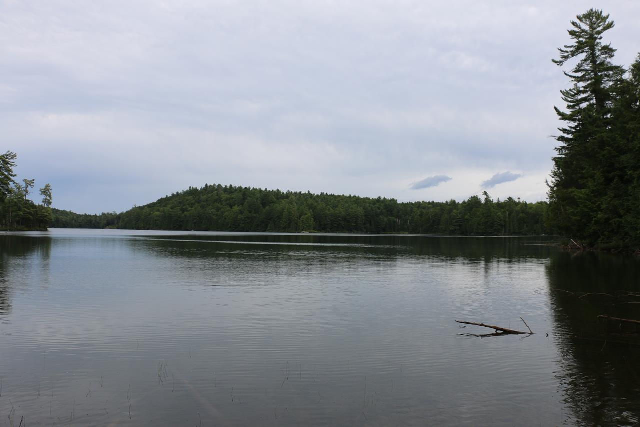 We loaded up for the trail, expecting the worst. Well, we were given the worst. As an introduction to the trail, a giant pine with massive branches blocked the trail. It was clearly a recently downed tree as there wasn’t any evidence of someone else making their way through it. I climbed over and through it as best I could, then had to set the canoe down for a moment to clear some movable branches for Angela and the next group. With that out of the way, the real struggle began. For about 600m of its 955m length, this trail is uphill. And there is a 100m section near the peak that is severely uphill. We had to take several breaks during this portage because it was just too much. It was unbelievable. I never would’ve guessed it, seriously. In the final 100m of the uphill part, it is so steep that I could only take about 4 or 5 steps, stop for a few seconds, take 4 or 5 more steps, stop for a second and repeat. When I finally got to the top I put the canoe down and collapsed onto the ground. My god, that was absolutely insane! Angela arrived at the top and made use of a big boulder perfect for sitting on. We just relaxed there for a solid ten minutes with no intention of moving. Eventually we got up and finished the trail. The latter half was almost equally challenging as it was a steep decent down to Little Osler Lake. Finally, after nearly 50 minutes of struggling, we made it to Little Osler Lake. However, we didn’t receive a warm welcome, in fact, it looked like it was going to pour rain any minute. Once again there was no sign of thunder or lightning so we make the choice to cross the lake. I took note of some potential campsites to stay at, but kept my camera away in case the rain started. It didn’t take long to cross the lake and the rain managed to hold off. We landed at the 700m portage to Osler Lake. I assured Angela this trail was entirely downhill, so it shouldn’t be too rough. Luckily my assumption was correct and we managed to get across the trail in about 15 minutes. This was our 6th portage of the day and after doing 6 yesterday we were really starting to feel it. Angela inquired about staying on Osler Lake tonight instead of Nadine. I said we could, but I’ve heard such nice things about Nadine that we should try and push for it. I suggested we could break for a while at a campsite on Osler or the portage to Nadine, but Angela agreed we should just push forward as the threat of rain was holding off, for now at least.