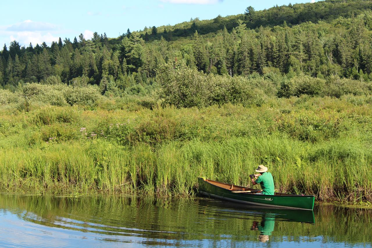 | Paddling the marshy narrows between the upper and lower sections of Club Lake. |