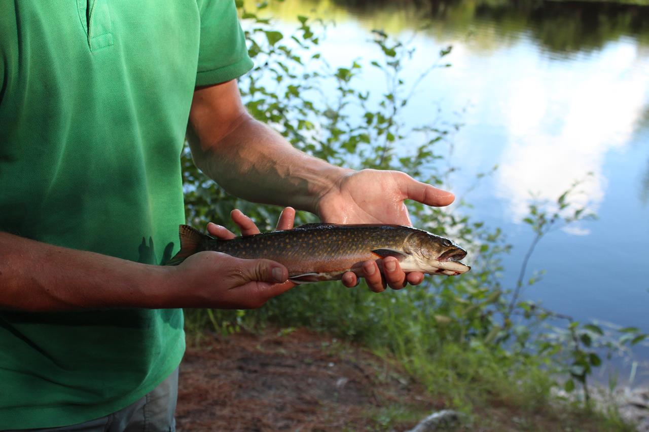 I tossed a few casts from the campsite in both directions, slowly reeling it back in each time. At one point I had a strike, but then nothing after. Eventually after a few more casts I snagged the lure in an underwater tree. I placed the rod on the mud bank and jumped in the canoe. I grabbed the rod and paddled to the other side of the snag and managed to free the line and salvage the lure. Since I was already in the canoe I figured I’d paddle downstream for about 50m to a connecting stream and toss a few casts that way. I paddled down and gave it a few shots, nothing. I was surprised because I’ve had very good success with brook trout in the Nipissing before. I had been in the boat about 40 minutes, just casting and reeling, casting and reeling. I decided to get a little closer to the connecting stream and beach the canoe on the opposite shore. I sat there in silence and without movement for a few minutes, then tossed the line across the river towards the stream. BANG! Something hit the line hard and was giving up a good fight. I tugged to set the hook and reeled him in. It was a good size fish for one meal, but we needed two. I tossed the line to try my luck at another. Nothing on the first cast but on the second I had a bite (even harder than the first). Another good size fish in little under an hour.