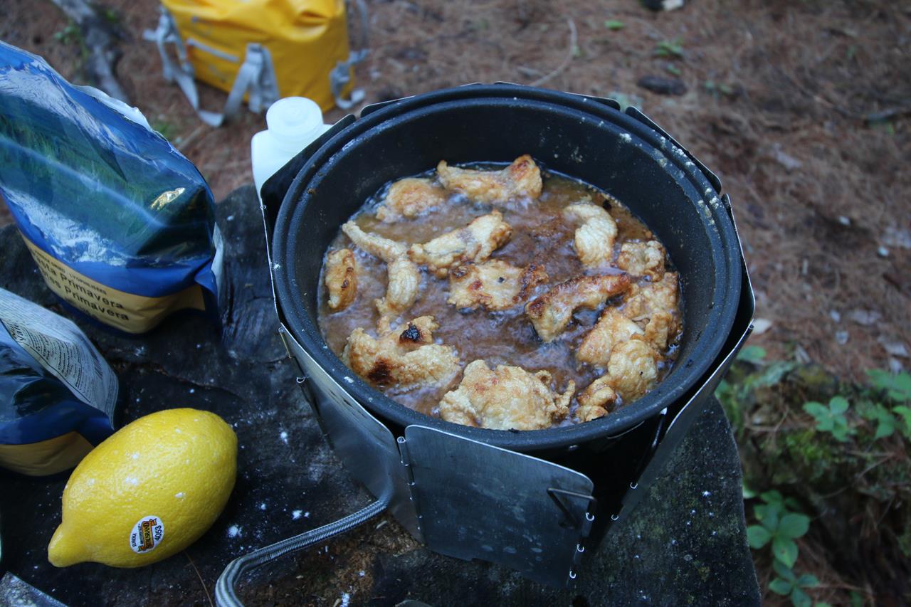 I made the short paddle back to camp to grab my fillet knife and cutting board. Angela collected wood and kindling while I took care of cleaning the fish – she doesn’t like to be around for that part. With the job done, and done well – I managed to get a ton of meat off these guys, very little waste, I diced up the meat into little chunks to be fried in oil. I tossed the chunks into a zip lock bag with flour and shook it up. Meanwhile, Angela had pre-mixed the bannock into a bowl and I watered it down to make the dough. Since the bannock takes a good while to cook, we boiled some water for the dehydrated pasta primavera and let that sit while the bannock was cooking. Later, with the bannock and pasta ready to go, I fired up the stove one more time and put about a half inch of oil in the pan. I tossed in the brookie chunks and let them fry. We had a huge feast of a meal ready to go to celebrate our last night in The Park. We filled our plates and took the chairs out to the river bank to enjoy dinner with a low-setting sun. By 8pm or so we had dinner finished and the dishes done. There was still plenty of light left so I decided to gather a bit more firewood so we would have some for the morning too. It didn’t take long as there were plenty of fresh blow downs in the area. I made a good pile and by then the darkness was setting in.