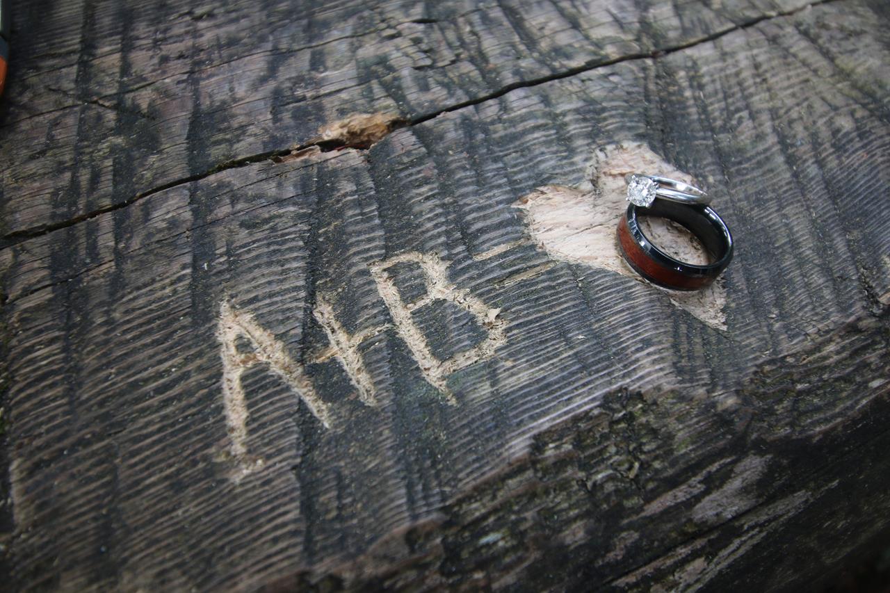 | Our engagement rings nestled in a carving on the bench at Nadine Lake. |