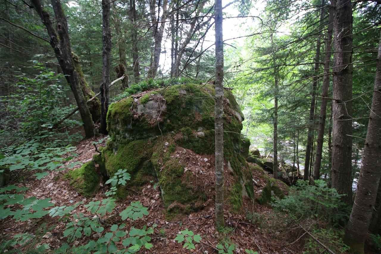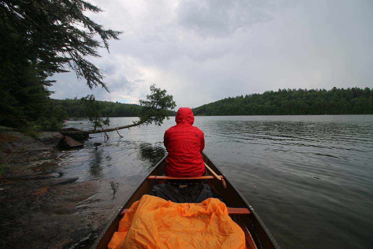 We took a chance and decided to paddle across Big Thunder Lake but remained very close to shore, in case lightning appeared. Well, let me tell you, Big Thunder Lake surely lived up to its name today. About half way across the lake, some of the loudest crackling and thunder I’ve every heard began. You could actually feel the ‘booms’. We couldn’t see any lightning and it wasn’t raining yet. We decided to make a super fast push to our final portage. A few minutes of nerve-trembling paddling and we arrived at the landing to P1495 to Erables Lake. Angela put her rain jacket on for this trail, I left mine off as I would be under the canoe anyway. We loaded up and within seconds of taking our first steps, the clouds opened up and it just poured on us. Very thick, very hard rain. We continued down the trail and the forest cover helped a little, but there were a few points in which so much water was dripping off the boat I began to laugh to myself, thinking ‘How ironic, the bottom of the boat is wet either way today.’ Just one of many silly thoughts one has while crossing a long portage. We walked for a solid ten minutes through the rain and I shouted out to Angela, asking if she wanted to take a break. She was good and I was too, so we decided to keep walking. This trail is relatively flat and easy to work with, however one section is a bit of a boulder garden and requires extra time when its slippery due to rain. Surprisingly, after another fifteen minutes we arrived at the other end of the portage. I couldn’t believe we walked the entire distance without taking a break. It took about a half hour to walk the trail, and the rain kept us encouraged as it lasted for the first 20 minutes or so.