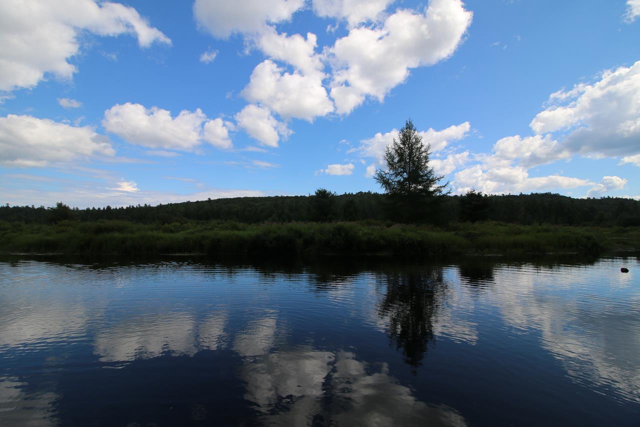 We launched at 12:45pm and I was looking forward to a nice, lazy-river type of paddle to our campsite, which was about 11km down river. The sun mixed with clouds continued and there was a light breeze in the air. The minor current of the river was working in our favor and we were having a great time. Half an hour later we rounded a corner and we halted to a dead stop – our path was blocked. Not by a moose or bear, but by a massive white pine that had recently fallen. This tree is huge and probably fell within the last couple weeks. There was absolutely no way under it due to huge branches pointing down into the water and the logs from a few other trees jammed up against those branches. It would be a slippery and spidery affair to navigate through. We looked to both shorelines to see which was the better to use as a work around. The side with the stump from the fallen tree looked very rough, but the other side had the crown of the tree. There was evidence in the mud that people were using the crown side and just climbing over the branches. This was a bit of a challenge as the river bank is very steep and high, with the only place to stand being a mud bank that will swallow your foot if you stepped in the wrong place. So much for my lazy river paddle to the next campsite eh? The obstruction in the river took about 20 minutes to pass, but neither of us got wet feet or fell in the river – so it was a success! Hopefully we wont see any more blowdowns like this.