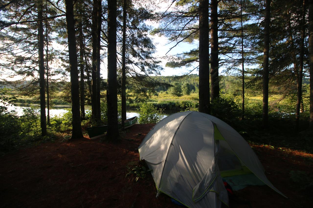 | The tent pitched high up off the water on Little Cauchon Lake. |