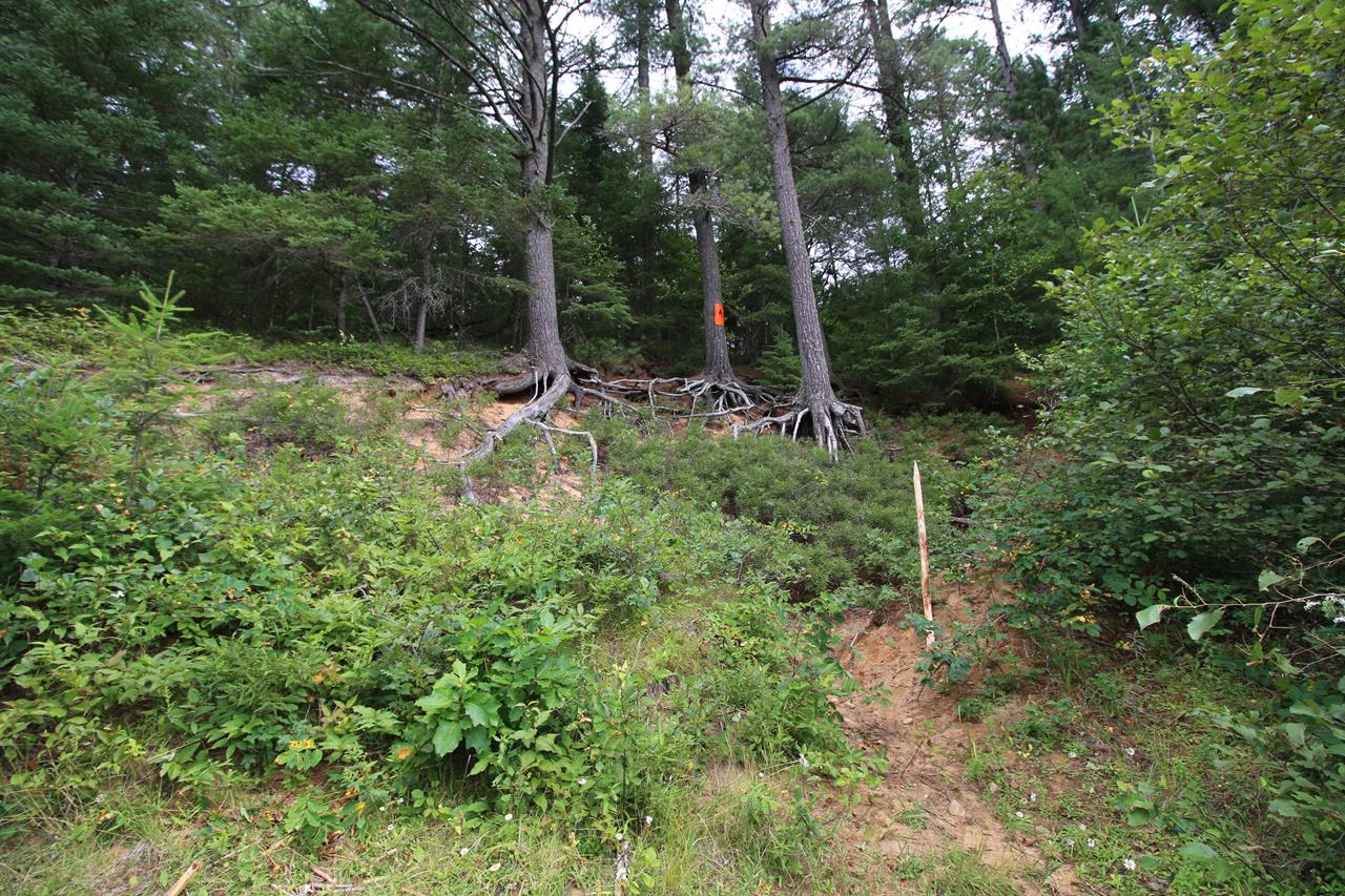At around 12:30pm we arrived at a little island close to the end of Cauchon Lake and decided to take a break behind it, out of the wind. Our arms were tired and I was a little hungry. We relaxed and had another snack and water. I had a déjà vu moment as I suddenly remembered breaking at this very same spot back in 2012 for the same reason. With a little more energy we made the push to the end of the lake – but not before first trying to pass the island on the west side, which was a fail as it’s not really an island as much as it is a jettison of land. We backtracked and went around the other way, eventually making our way to the landing of the portage to Mink Lake. I made sure to pay attention to the last campsite on the Cauchon Lake as I remembered making a mental note about it back in 2012 while on a previous trip. I couldn’t remember what made me think it would be an awesome site (it does have an interesting view) but I was glad I would get to see it today. Well, I have no idea what I was thinking in the past, because as we approached the campsite I immediately knew I would never stay there unless I had to. It’s not that it was horrible, it was just a small patch of land at the bottom of a steep hillside. It didn’t stand out in any way, shape or form. There are much better campsites on Cauchon Lake. Strange, perhaps I was thinking of somewhere else.