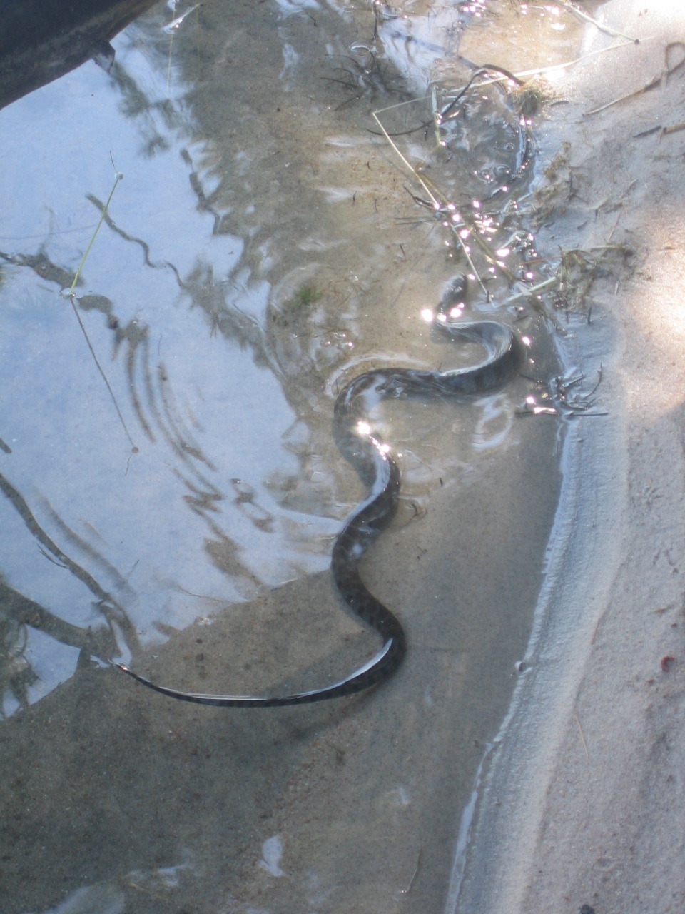 A water snake cruised by our site, 10ft offshore, so we stalked him down the shoreline as he came shallower and shallower. We lost sight of him for a second in the brush, until 3 frogs erupted for the trees! I told the boy that his harassment of the frog population had them on high alert, and saved them from being snake food this time!