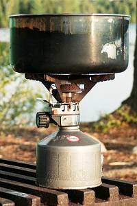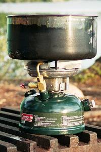 White Gas Stoves: These stoves run on white gas or naptha ... a highly refined form of gasoline. Most of these stoves come with a hose and a valve fixture that attaches to separate refillable metal fuel bottles, precluding the need to pour fuel while on the trip. A manual pump ensures vapour pressure for the burner, while a fuel-air-mix control aids start-up. Photo: This is a style that uses a fuel tank permanently attached under the burner assembly. Once this tank runs out, it has to be refilled manually. An evolution of this stove is the multi-fuel stove. More frequently used in other countries, it will work with a broad range of fuels ... white gas, unleaded gas, kerosene or dry-cleaning fluid. However, each time it's used it has to be put through a priming-burn procedure. Also, it tends to be less precise and quite noisy. |