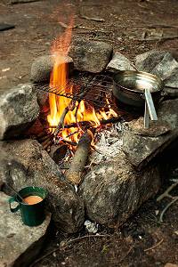 Campfire Grill: Someone once designed a heavy wrought-iron campfire grill and each Algonquin interior campsite is usually equipped with one of them. Part of one is visible in the above photos. They're 16 inches square and come in two heights .. either 12 or 24 inches. They originated when firewood was considered an unlimited resource. Now, they serve best as a fireside seat or food preparation table. These days, most campfire cooks incorporate an old fridge or barbque grill into the stones across the back of the firepit. There's often a number of these smaller grills left behind at campsites because they become too dirty and bent to repack. If you're worried your site won't have one, snap one up at a yard sale and take it along ... 12 by 20 inches is usually adequate. When preparing your campfire and grill, there's a few points worth noting.