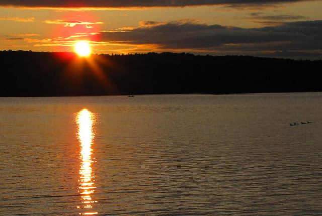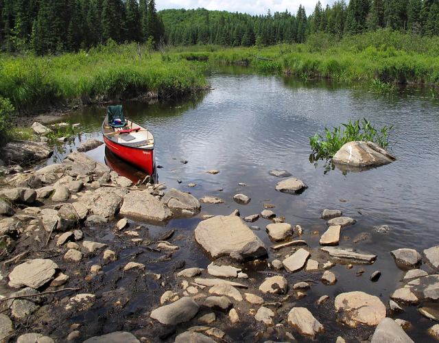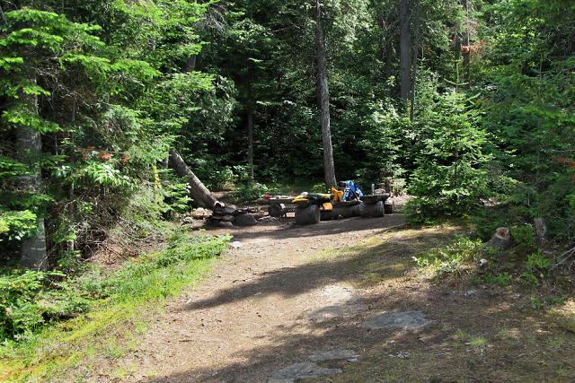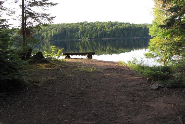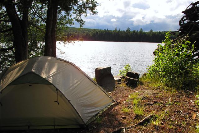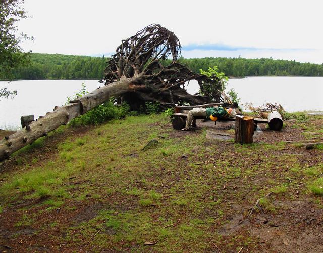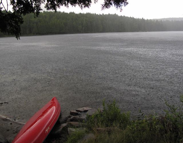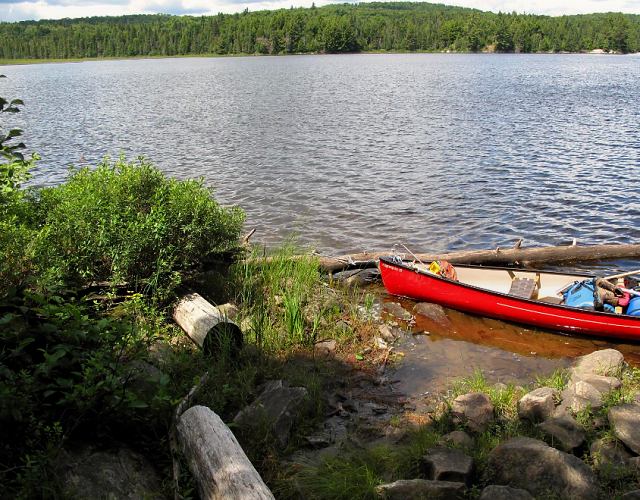 Route-Linear : 43 km paddling + 7km portaging Day 1 - 18 July 2009, Cache Lake to Harness Lake 06:00 – Rob arrived. Since we had sat down a few days before and gone through our gear, it was all packed and ready to go. We loaded the gear into the truck, with the canoe on top. We picked up a coffee at the end of the street, and hit the road, around 06:40. Near Bracebridge, I took over the driving, as Rob had a party the night before, and needed a little nap. 09:00 – We arrived at the Portage Store, and I ran into the permit office, and registered our trip, and then drove to our put in at Cache Lake. We loaded up the canoe, and had a potty break before setting off. 09:40 – Paddling off we took the scenic route between the islands around Cache, which took longer but we figured we had lots of time. We passed a couple of groups coming the other way, and exchanged hellos. 10:30 - 11:00 – After hunting for a bit for the portage into Head lake, we located it, after realizing the sign was missing. A cottager advised us it had been missing for a little while. The take out was quite steep, and I learned my first lesson about tying things to my pack. I had a little pair of binoculars, I was going to use to spot portage signs, and wildlife, until I dropped them in the drink while lifting out my pack. They filled with water, and remained useless for the rest of the trip. We set off across the 1640m portage, and we chose to do a leapfrog style double carry, as we had 3 bags, plus the canoe and gear. Since the boat is mine, I carried the boat and Rob took the heaviest pack most of the time. With the other 2 packs, we shared the load. The trail had a few muddy sections, but was in good shape, and nothing was too challenging other than the length. 12:00 – We were done the portage, now looking out over Head lake and took a break to eat a snack, and have a rest before loading the canoe and heading off. After setting out, we decided to go and check out the portage to Kenneth Lake (240m). We left our boat and just walked it to check Kenneth at the other end. The portage clearly isn't used much, and was overgrown with grass, but still wide and generally free of major obstructions. A few photos were taken, and we headed back to our boat to continue on our adventure. ![]() Head Lake seen from the Kenneth Lake portage. 12:30 – We continued across Head Lake, and made our way up the river. After a few lift overs, we pulled up to the portage into Harness Lake. The take-out was rocky, and you needed to be sure of your footing when loading the canoe on your shoulders. But the sun was out and it was a nice warm day. ![]() Head Lake portage take-out to Harness Lake. 13:00 - 13:20 – We set off on the 1050m portage, and took the same strategy as before, with the leapfrog double carry idea. It seemed to work well for us. We met several groups coming across the other way, as this was Saturday, I figured we would meed people coming out at the end of their trips. The rain started near the last ½ of the portage, and became quite heavy as I reached the end. The last little bit I took the canoe, and our smallest bag, so I waited at the end for Rob to finish with the last pack. I sat and photographed the rain on the water, as it was rain with little to no wind, so made for a couple of great photos, and hear Rob curse the mud slide on the hill about ½ way along the portage. He quite clearly described the route options to two couples we met just coming off Harness, as choosing the river in the middle, right or left as your choices on the clay/mud hill. We waited it out, and after it let up, we loaded the canoe and pushed off. ![]() Harness Lake, seen at its put-in from Head Lake. 14:30 - 15:00 – We paddled to the site of choice, which those in the know speak of .. on the east side of the lake at the narrows. It was a great big site, with a few tent locations, and a sheltered landing. We set up our tent, a little out in the open but sheltered from the prevailing winds so as to have the best view from inside for the morning. We ate a couple of wraps, as all we'd had was a snack at noon at the end of the Cache-Head portage. Rob still wasn't feeling 100% so he pulled up a bench and drifted for a while. I explored the site and collecting a bit of firewood in case the clouds blew over. 16:40 – We had the lake to ourselves until now. Several canoes arrived from Head Lake, and they were noisy, and appeared quite disorganized, with a mix of adults and kids. The rain started up again, and blew in on and off for the rest of the evening. 18:00 – I cooked up our 1 pot meal of pre-cooked chicken and some rice with veggie flakes. It turned out to be way too much food for the 2 of us, and since the weather was not spectacular, we packed up the excess to be carried out. We didn't delve into the Scotch tonight, and Rob hit the hay around 7pm. The rain continued off and on, and the winds died down some around sunset. I knocked off the dishes and with nothing else to do but watch the clouds and rain blow through, I called it a night. 20:40 – I crawled into the tent. What a party animal!!! ![]() Harness Lake campsite at the narrows. ![]() Harness Lake campsite - tent with a view. Day 2 – 19 July 2009, Harness to Louisa Our sleep through the night was broken, no doubt due to the early bed time. Nothing to do but listen to the wind and rain. 05:30 - 06:00 – I was up for the day, and finally gave up on laying in the tent pretending to sleep. Rob was still sleeping, and I enjoyed the morning quite all to myself. The rain was still off and on, but very light, a little more than a heavy mist, or light sprinkle at times. The wind was light, and the sky was grey. 07:00 – Rob got up. We decided to forgo the coffee at this time, and just ate our Banana Breakfast bars. We tore down and loaded up the canoe, ready to set off for the day, ahead of our anticipated schedule. 08:00 - 08:30 – We paddled the rest of Harness Lake, filtering 