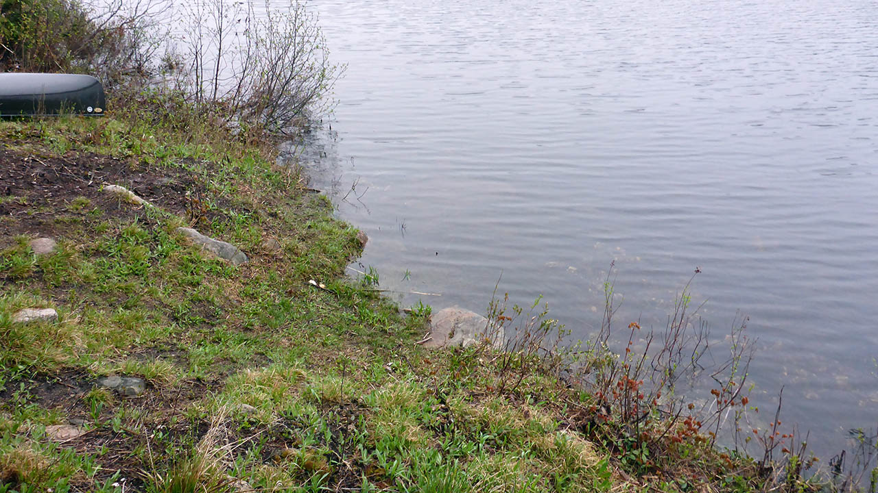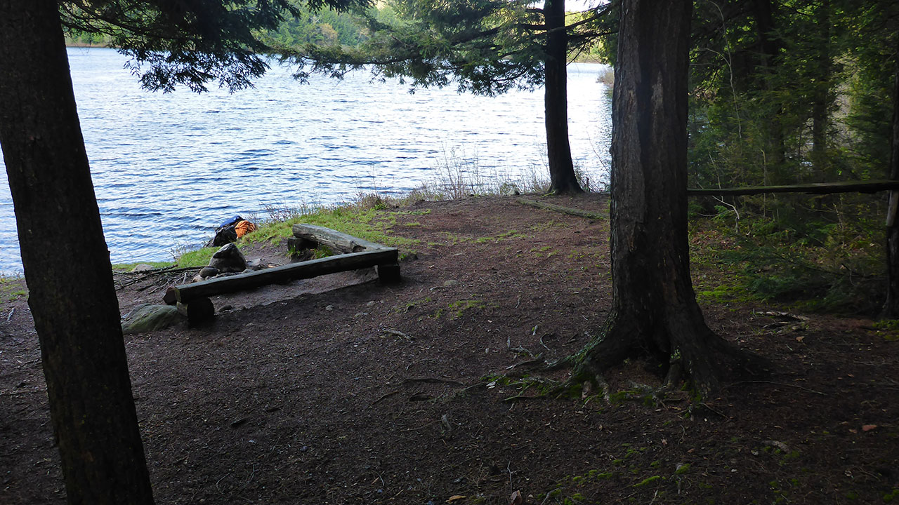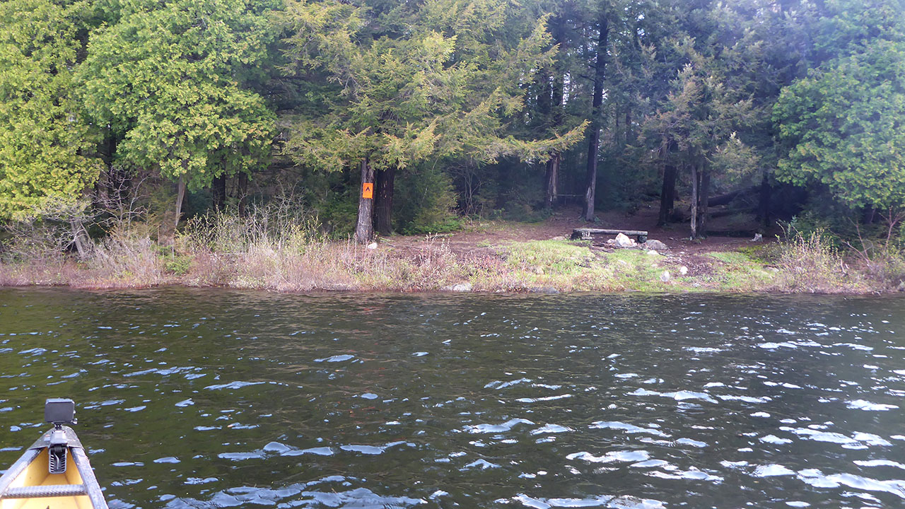 Campsite Location GPS - UTM location: N46° 03.189' W78° 57.114' Located on north side of river, approx. 1/2 Km east of portage to Manitou Lake Landing Topography of under-water approach: Small and medium sized rocks covered in silt. Impediments to disembarking from and/or unloading a canoe: None, step into ankle deep water, or directly to shore from the canoe. Topography leading to tent sites: Short, unimpeded carry.