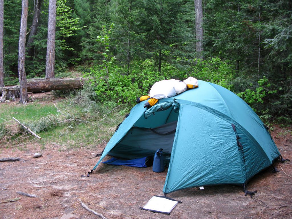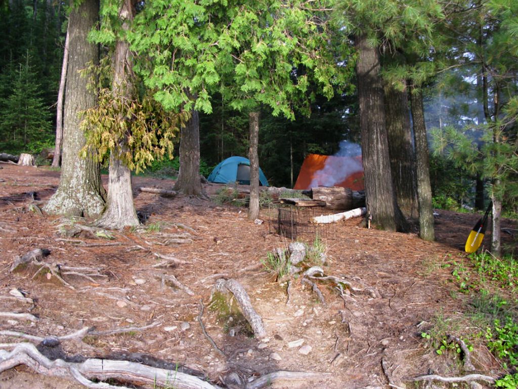 Campsite Campsite maintenance: regular Size of open area: 120' x 150'. Extent of tree cover: 35% canopied over tent/kitchen area. Degree of levelness: Campsite had a consistent 30 degree taper back down towards the beach - even the tent site was slightly angled. Number of level tent sites: At least 2 slightly angled sites adequate for 3-4 man sized tents. No flat spots. North exposure: Protected from the north winds due to proximity to forest and hills butted up against campsite. East exposure: Protected from the east winds due to proximity to forest and hills butted up against campsite. South exposure: Southern exposure from canoe landing only, southern point that juts out below campsite helps block the more direct strong southerlies. West exposure: Full western exposure to these winds on landing and tenting/firepit area - you'll be at the winds mercy. Insufficient cover to limit wind exposure on the western-facing slope.