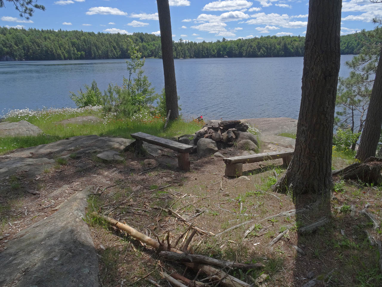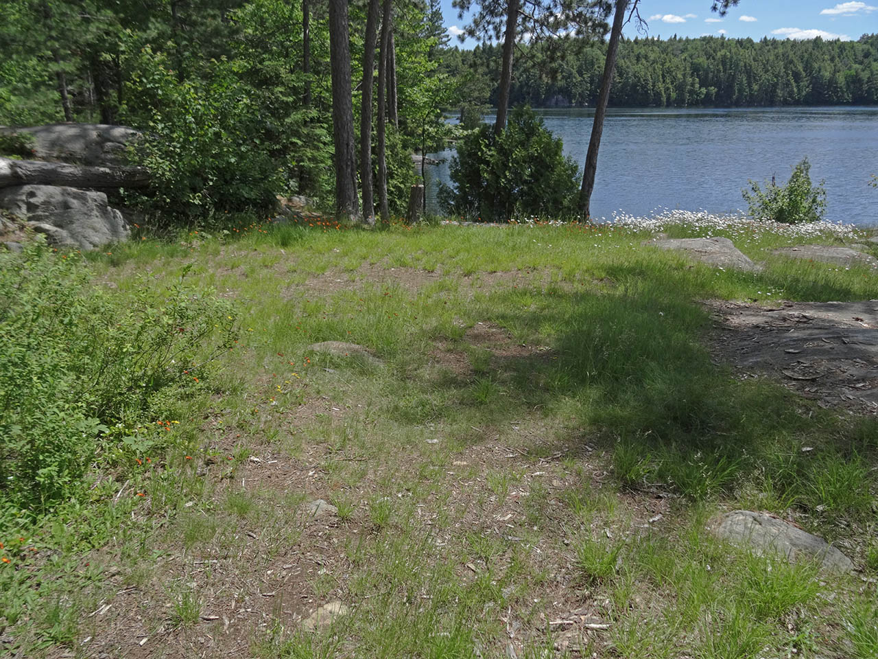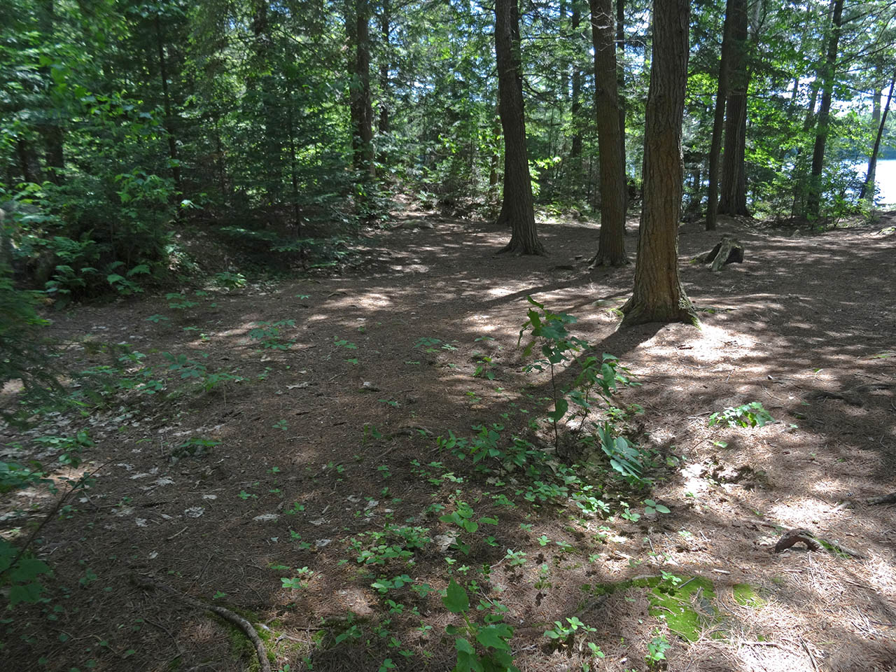 Campsite Campsite maintenance: regular Size of open area: 50' x 70'. Extent of tree cover: Three pines provide partial cover of the firepit area, while there's no cover over the open grassy tentsite area beside it. There's a second tentsite area which is under tree cover to the rear. Degree of levelness: The firepit and first tentsite area is generally level. Number of level tent sites: Two tents could be squeezed on the open grassed area (but without trees for tarp support). A third tentsite is located back in the trees. North exposure: Protected from the worst of the north winds by intervening trees. East exposure: Inland forest blocks the east winds. South exposure: Limited protection to the south. West exposure: Fully open to the west wind and sunset.