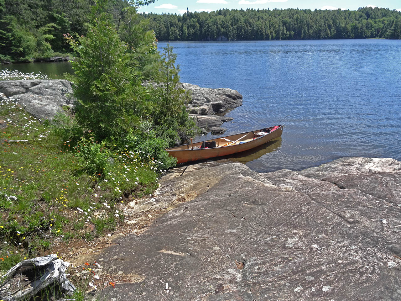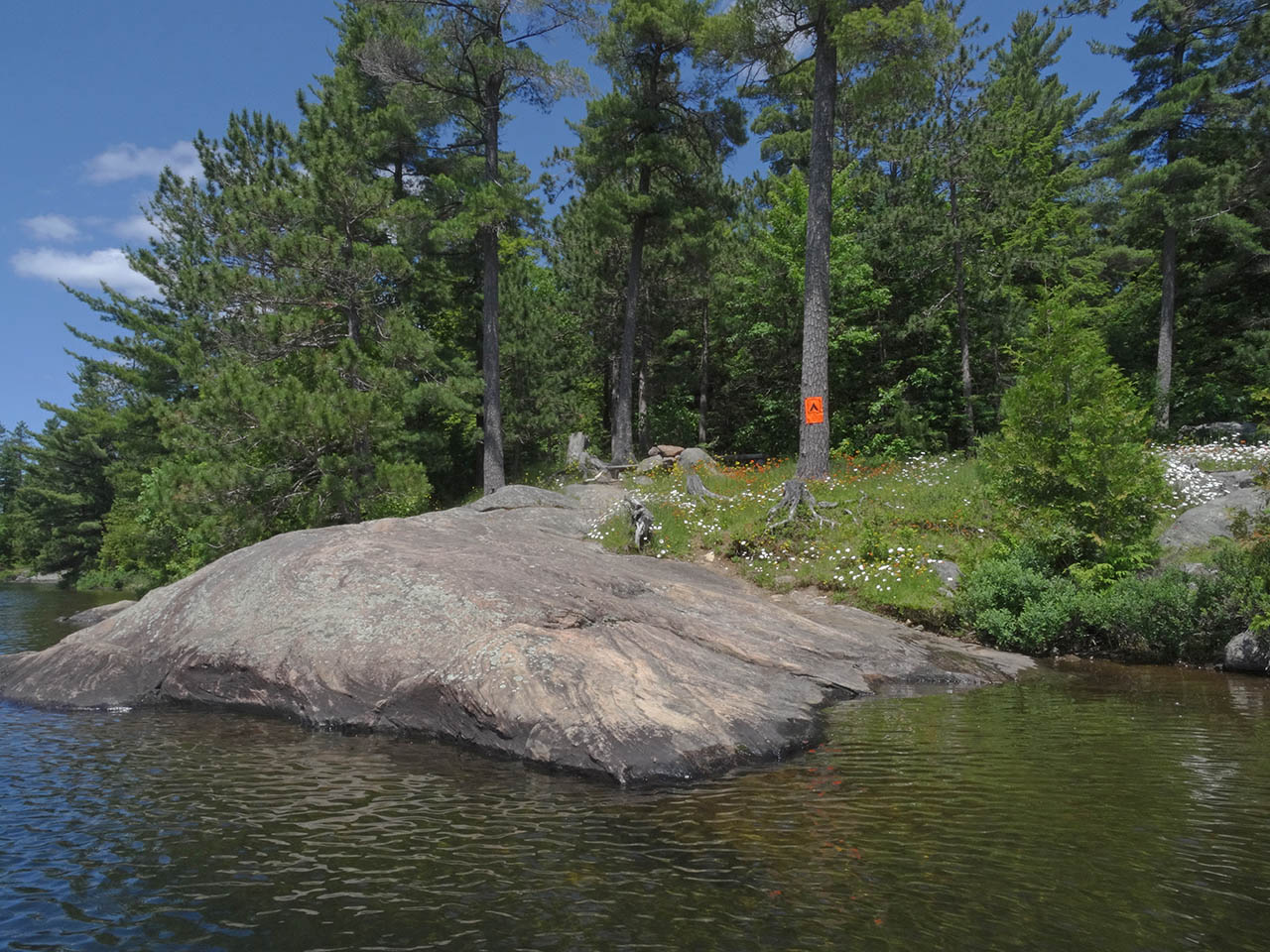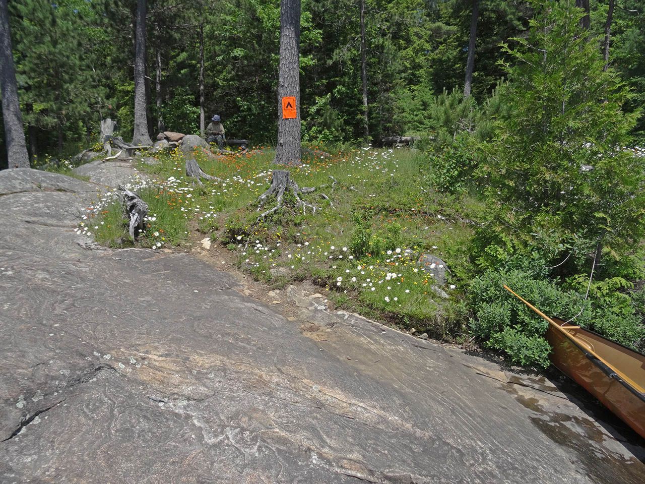 Landing Topography of under-water approach: On the south side of point, a large rock slopes down into water .. with a small area floored with sand and gravel. Impediments to disembarking from and/or unloading a canoe: With one's feet in the water, the sloped rock serves for unloading .. afterwhich one's canoe can be lifted up on to the rock. Topography to tent sites: 20' rise up a large rock slope to the actual firepit and tentsite area.