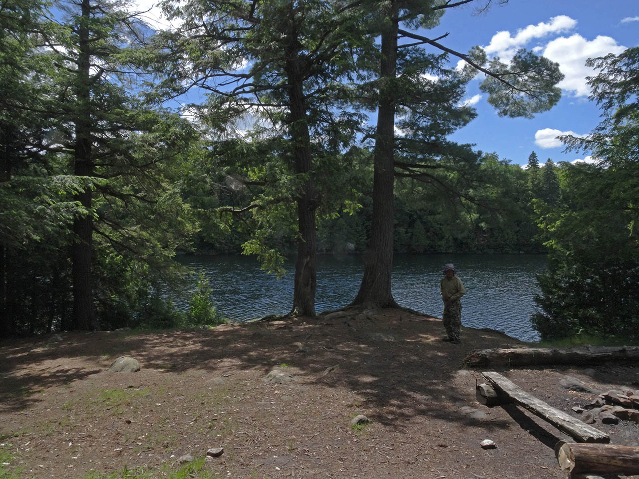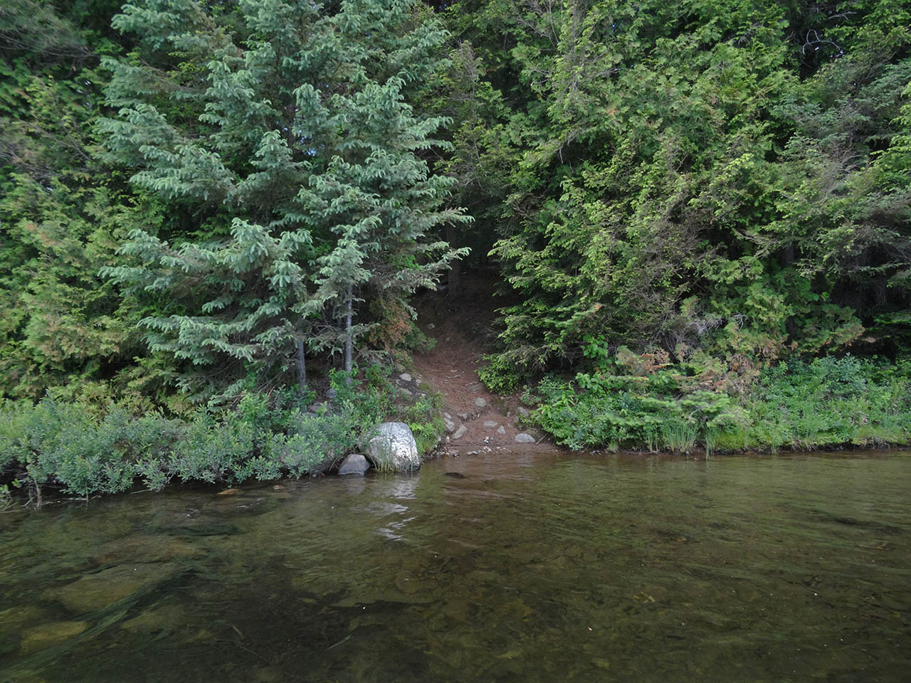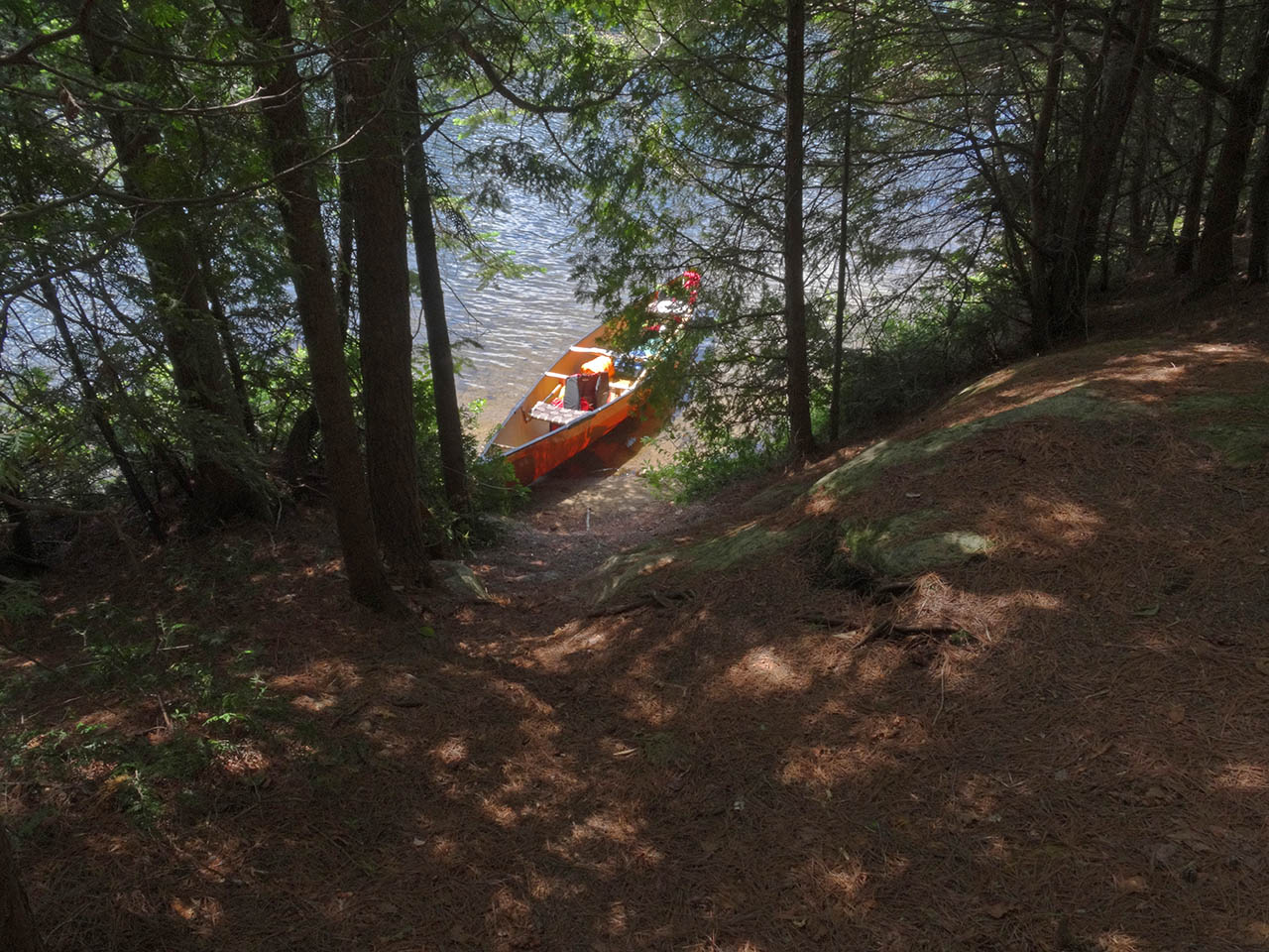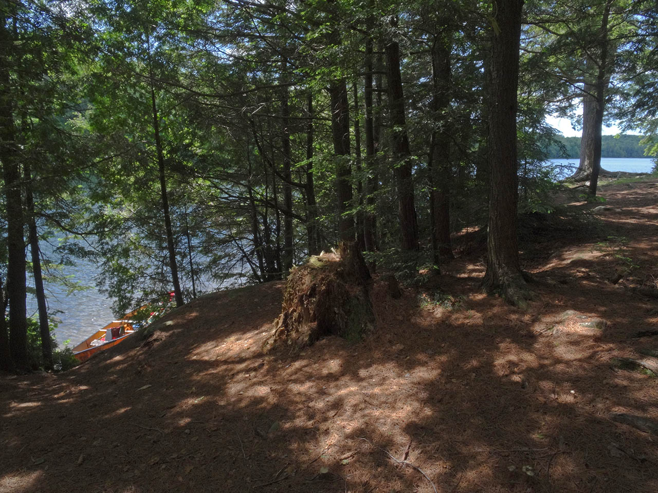 Landing Topography of under-water approach: On the south side of point, the two landings have shallow approaches. Impediments to disembarking from and/or unloading a canoe: Each landing can handle only one canoe at a time. Canoes have to be brought up a distance for storage or to free the landings for any more use. Topography to tent sites: A steep, 20' dirt rise up to the firepit and tentsite area.