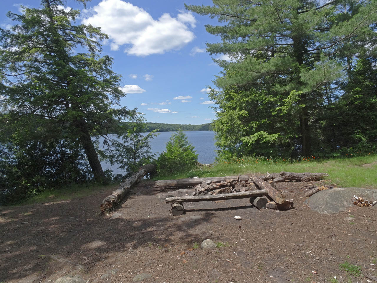 Campsite Campsite maintenance: regular Size of open area: 50' x 50'. Extent of tree cover: Firepit and tentsite areas are open to the sky. Degree of levelness: The firepit and tentsite areas are on one level. Number of level tent sites: Three tents could be erected immediately around the firepit area, but without enough trees for full tarp support. North exposure: Partially potected from north winds by a few intervening trees. East exposure: Inland forest blocks the east winds. South exposure: Substantial protection from south winds. West exposure: Partially potected from west winds by a few intervening trees. The mainland is so close as to seriously limit the sunset view.