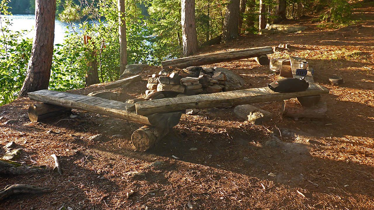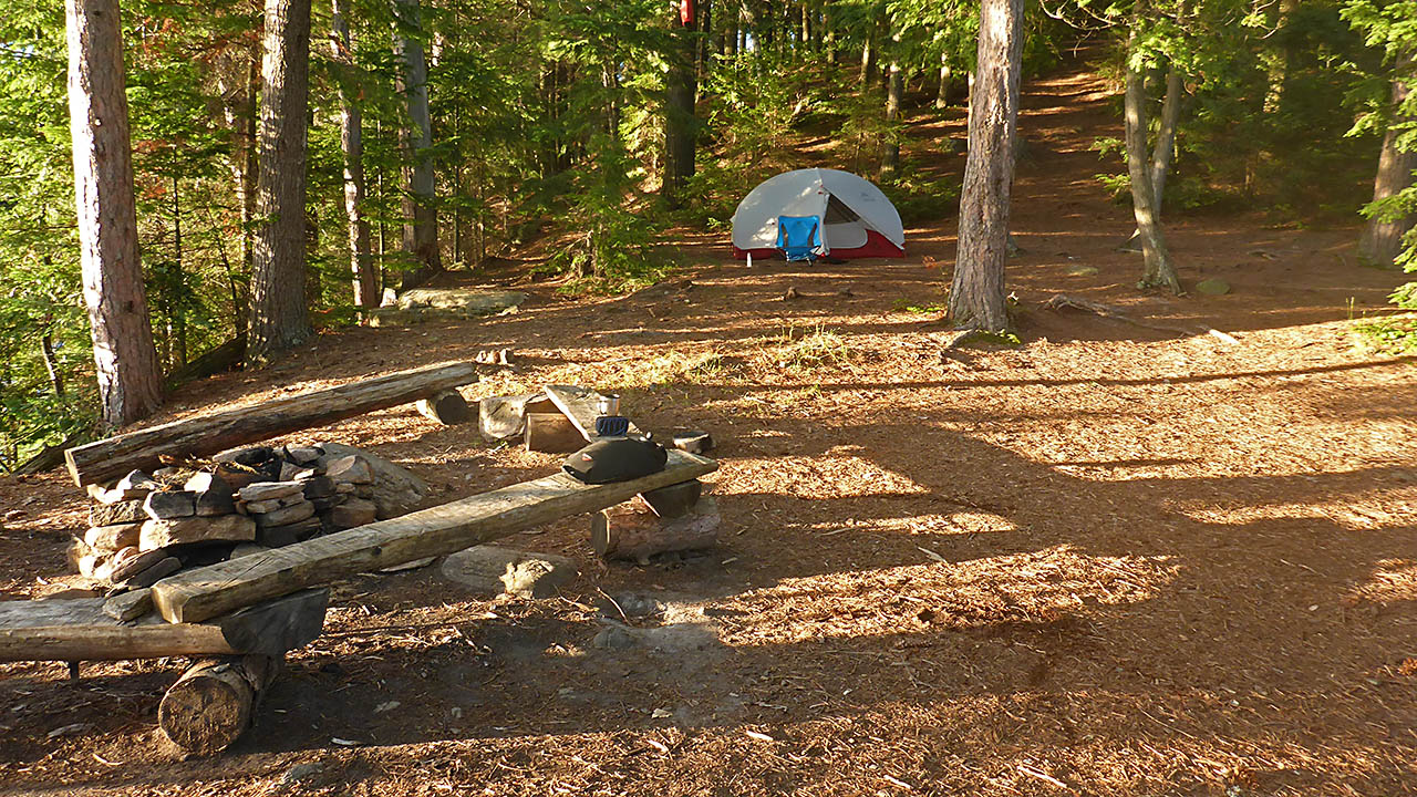 Campsite Campsite maintenance: Regular. Size of open area: 15m x 5m. Extent of tree cover: 70% mostly at back of campsite. Degree of levelness: Noticeable slope from back of site to lake. Number of level tent sites: 2. North exposure: trees and slight view of lake. East exposure: trees. South exposure: obstructed view of lake (trees on site and island directly to south). West exposure: partially obstructed view of lake. General description: The length of this campsite follows the western shore, and slopes to the landing area at the southern edge. There are a couple of flat areas for tents, one at the highest point of the site, and the other flat area closer to the firepit. A nice firepit with a great western view from the firepit area.Overall accessibility: Small landing area, but otherwise no accessibility issues.