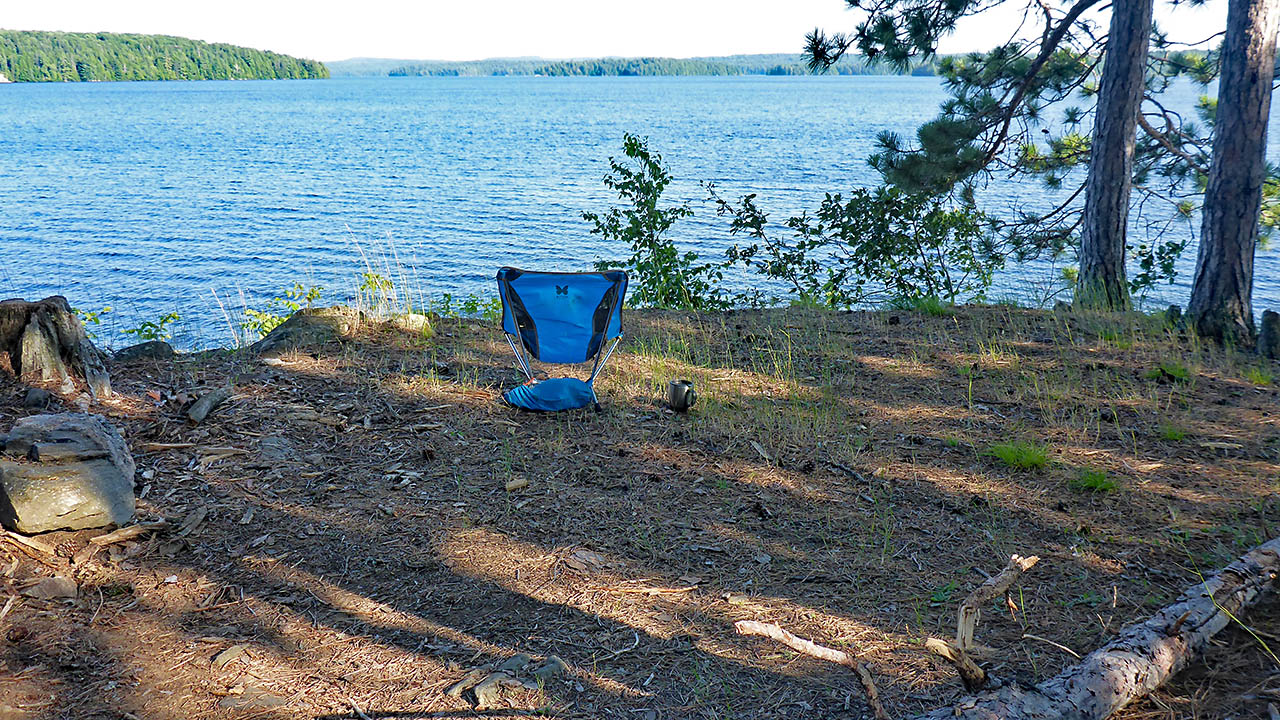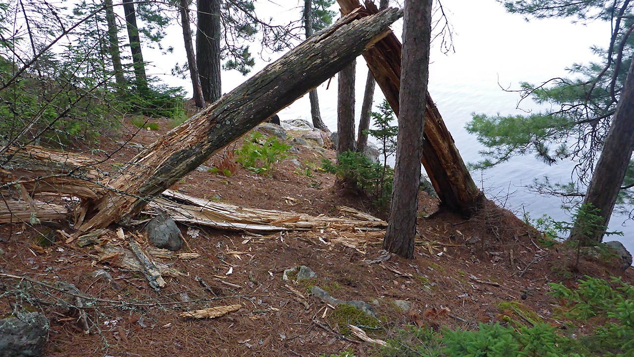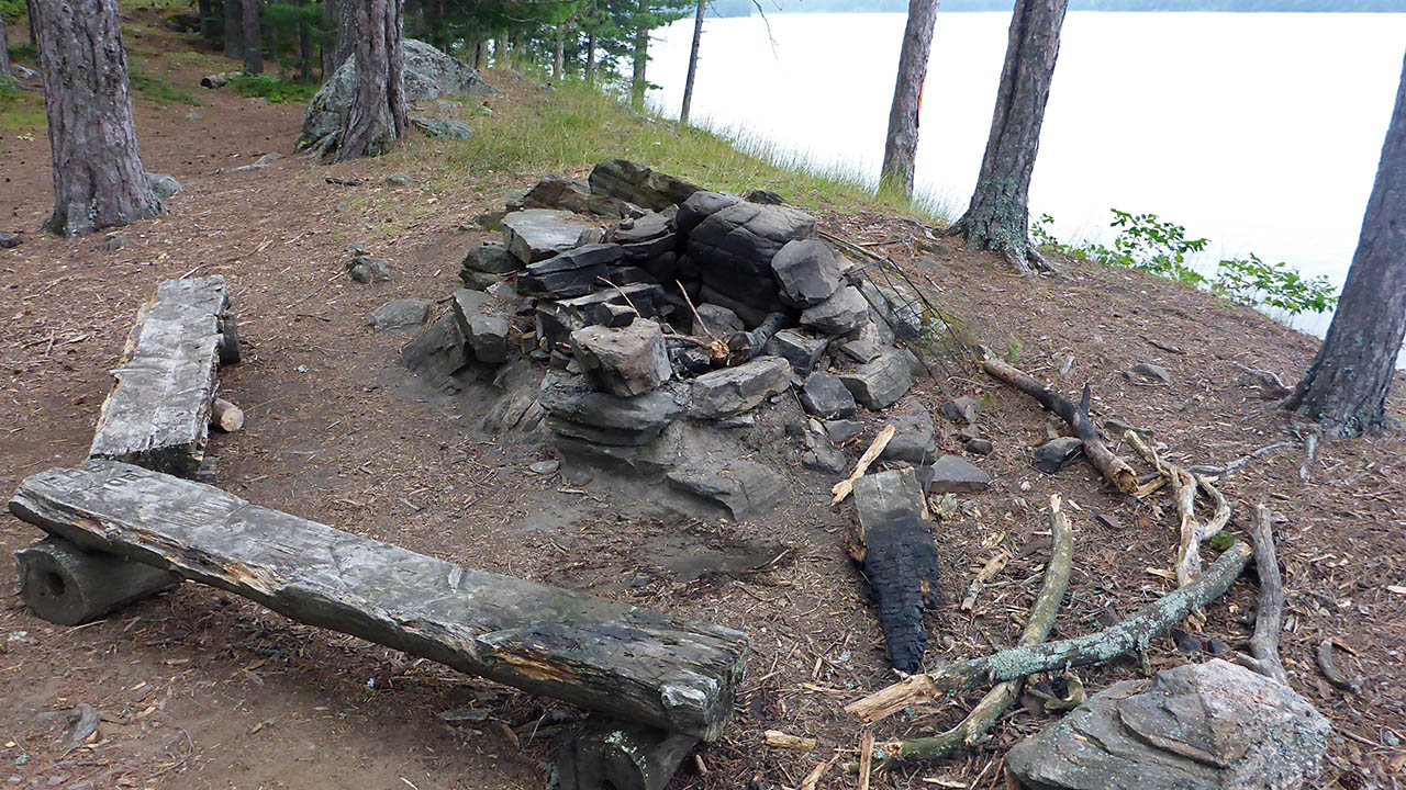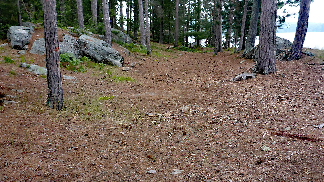 Campsite Campsite maintenance: Regular. Size of open area: 15m (long) x 3m (northeast) x 10m (southwest). Extent of tree cover: 30%. Degree of levelness: Fairly level and flat. Number of level tent sites: 4+. North exposure: large treed hill. East exposure: open view of lake. South exposure: open view of lake. West exposure: open view of island to the west. General description: A pie shaped campsite that has some protection from northerly winds, is otherwise very open to the elements. Situated on the southern point of the island, the view of the lake is unobstructed. The flat area leading to the landing area can accommodate 3 tents while another area beside the firepit could also be used.Overall accessibility: The trail from the landing area can pose a challenge as (at this time) you must carry your gear under a semi-felled tree, and the beginning of the trail is somewhat "side sloped".