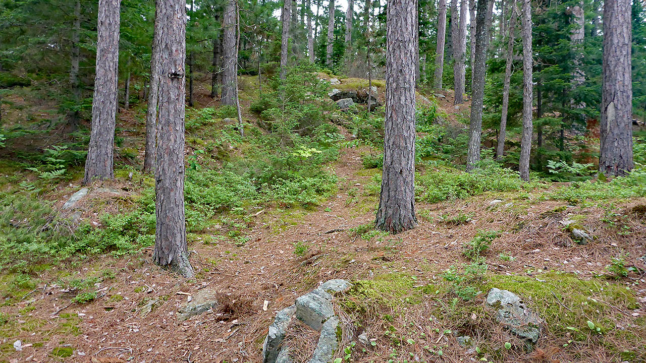 Landing Topography of under-water approach: Flat, smooth rock that extends underwater. Impediments to disembarking from and/or unloading a canoe: None, items can be unloaded to a flat, smooth area. Topography leading to tent sites: 5m elevation on 20m trail to tent site. Path is somewhat "sidesloped" at the landing, and some obstacles were present at the time of this visit.