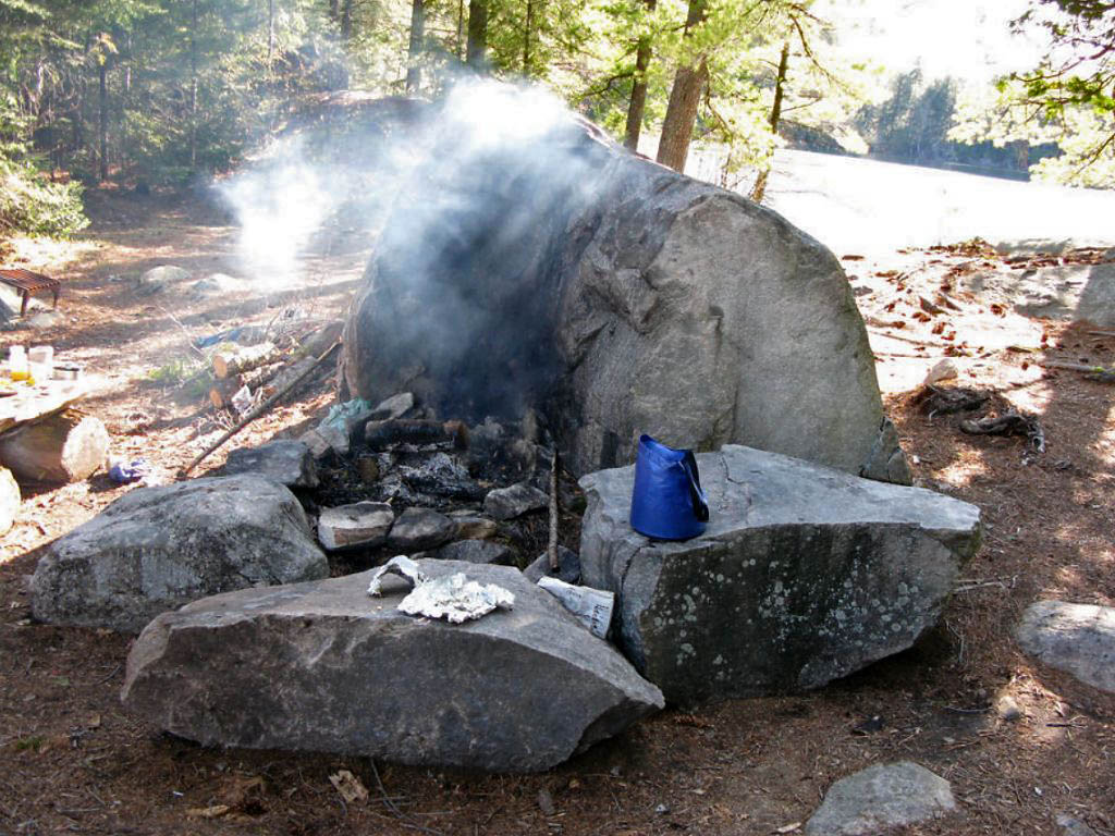 Landing Topography of under-water approach: Landing on Cradle was over a 2+’ deep fist-sized rock and larger boulder shelf to the west of the campsite. Landing on the Bonnechere Lake side (east) was shallow slowly tapered mud and soil ‘beach’. These were spring water levels. It would likely be a firmer rockier bottom during normal to low water levels of summer/fall. Impediments to disembarking from and/or unloading a canoe: During high water levels the canoe landing on the Cradle Lake side can be deep and a tad steep but there was adequate ground space for gear placement for unloading/loading one canoe. Landing along the Bonnechere lake side may be a bit muddy at times, depending on water level, but there was adequate dry firm ground a few meters up from the canoe landing for at least 2 canoes. Topography to tent sites: Slow taper uphill along a 20 meter forest trail back towards campsite and firepit area from Bonnechere Lake – maybe a difference of 3 meters in height. Cradle lake sat higher than Bonnechere, a 1 m elevation difference between lake and campsite area, plus a bit closer to tenting/firepit location. Campsite’s canoe landing, Bonnechere lake’s side, south view ... Canoe landing, Cradle Lake’s side, west view ... Campsite’s firepit – natural boulder windbreak / heat reflector. ... Campsite Campsite maintenance: regular Size of open area: 140 x 140'. Extent of tree cover: 80% canopied over tent/kitchen area. Degree of levelness: Relatively flat around firepit and tenting area, a few depressions. Number of level tent sites: At least 3 flat sites adequate for3-4 man sized tents. North exposure: Good protection on account of the tree line between Cradle and campsite. Even in strong north winds, Cradle is small enough for the exposed canoe landing to be manageable. East exposure: Very good protection from the east – thick evergreen forest provides the cover against any east winds. South exposure: Southern exposure from canoe landing only on Bonnechere side – shouldn’t be an issue on account of the lack of water volume, which reduces wave buildup. West exposure: Very good protection from the west– thick evergreen forest provides the cover against any westerly winds.. General description: Unique campsite in that it neighbors two lakes, both with canoe landings. Nice campsite – very large area with good wind protection. Large rocks propped up around firepit provides decent table surfaces. There were a few rough seating benches present around firepit area. A 2nd large open area to the south of Bonnechere canoe landing had a 2ary firepit and space for at least another 2 3-man tents. Grills were present at main firepit. Firepit well protected from north and east winds and ample wood collecting opportunities to the north of campsite. Unique thunder box location was 40 meters outside of campsite on top of a small knoll with an impressive-regal like view overlooking Cradle lake – Overall accessibility: Good. ![]() Thanks to Jeffrey McMurtrie of Jeff'sMap for supplying the base-layer map component by Creative Commons licensing. Submitted by Stephen Molson, November 2009 .. visited May 2009. |