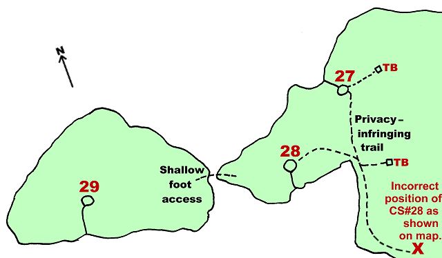 Note: As of 2013, this campsite is incorrectly located on many maps as being far to the south. Campsite & thunderbox signage and firepit have clearly been in the location as shown in the diagram below for a number of years. The absence of this campsite's true location on the maps apparently can lead some campers to doubt the 'legitimacy' of this campsite and to not respect its occupants' privacy. Over my stay here in 2013, a woman approached from campsite #27 while I was hoisting my food-pack and asked me what I was doing there. Once she realized it was a legitimate campsite, she left. On another occasion, young boys from campsite #27 took to frequenting the trail to my thunderbox. So as to assure my privacy, I flagged the trail. On still another occasion, a group of three young girls from campsite #29 walked across the shallows from the island and indignantly announced they intended to gather firewood, apparently considering me a squatter of sorts. I promptly indicated the official campsite sign, firepit and my tent .. and said I didn't want them on my campsite and that they should immediately return to their own campsite. As long as this campsite is not properly located on the maps, this kind of attitude and behaviour will probably repeat. Locations of campsites 27, 28 and 29 ... Landing Topography of under-water approach: Sandy approach alongside large sloped rock. Impediments to disembarking from and/or unloading a canoe: The sandy bottom is at a depth and the shore is slightly abrupt .. typically requiring a feet-in-the-water unloading of gear up on to the adjacent shore and pulling of the canoe out of the water. Topography to tent sites: Once the shoreline's four-foot high sloped rock is climbed, one is at the campsite's level. The sandy-bottomed approach is to the right of the sloped rock area ... The sandy-bottomed approach is visible beyond the sloped rock ... This sloped rock catches the early afternoon sun, while the tentsite at the rear remains in the shade ... Campsite Regular or low-maintenance: Regular Size of open area: Main open area is approximately 40 x 80 feet. Extent of tree cover: East end tentsite (at rear) has mature tree cover. Northwest tentsite area has only partial tree cover. Degree of levelness: Generally smooth level surface. Number of level tent sites: 3 tent sites. The firepit overlooks the water and is somewhat open to the sky ... Room for a couple more tents northwest of the firepit ... View to the southwest, from the shore beside the firepit ... North exposure: Trees block view and wind. East exposure: Mature forest. South exposure: View of the lake and mainland across small bay. West exposure: Trees block view of adjacent island, while the island blocks northwest wind and sunset. General description: While the campsite is level and somewhat spacious, it has few overhead sheltering trees, it has a limited view of the lake and its privacy is compromised by being improperly located on maps (see opening comments). Overall accessibility: Disembarking and unloading is a bit of a challenge. Accessing the thunderbox is a lengthly hike around the small bay to the south. ![]() Thanks to Jeffrey McMurtrie of Jeff'sMap for supplying the base-layer map component by Creative Commons licensing. Submitted by Barry Bridgeford .. January 2014 .. Visited July, 2013 |
