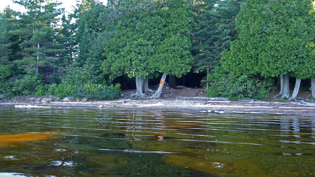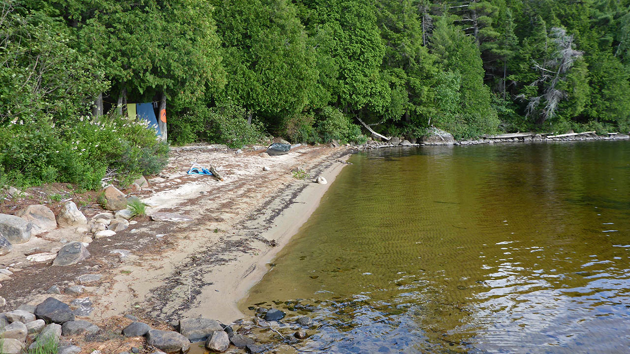 Campsite Location GPS - UTM location (optional): N45° 53.142' W78° 39.473' Landing Topography of under-water approach: Sandy beach. Impediments to disembarking from and/or unloading a canoe: None. Topography leading to tent sites: A short carry across the sand up a slight rise to the site.