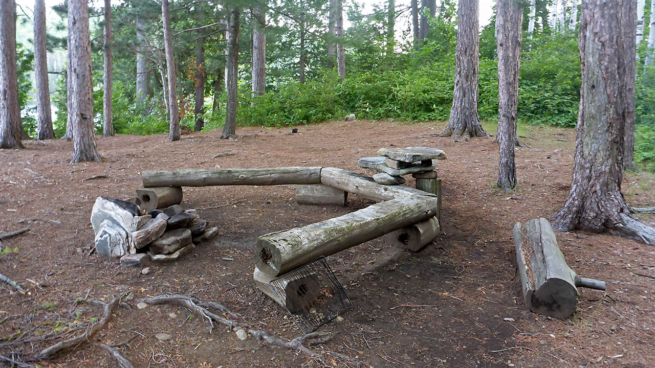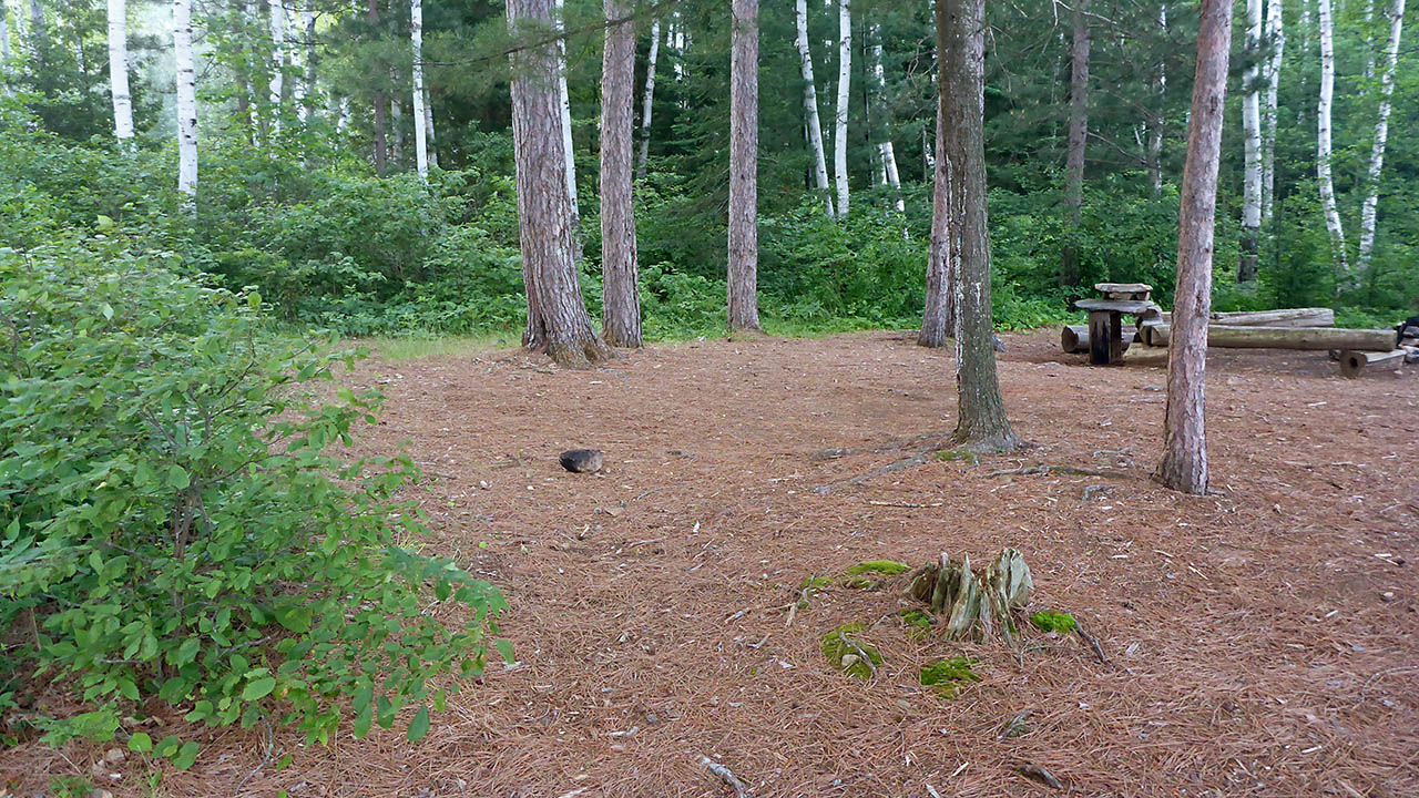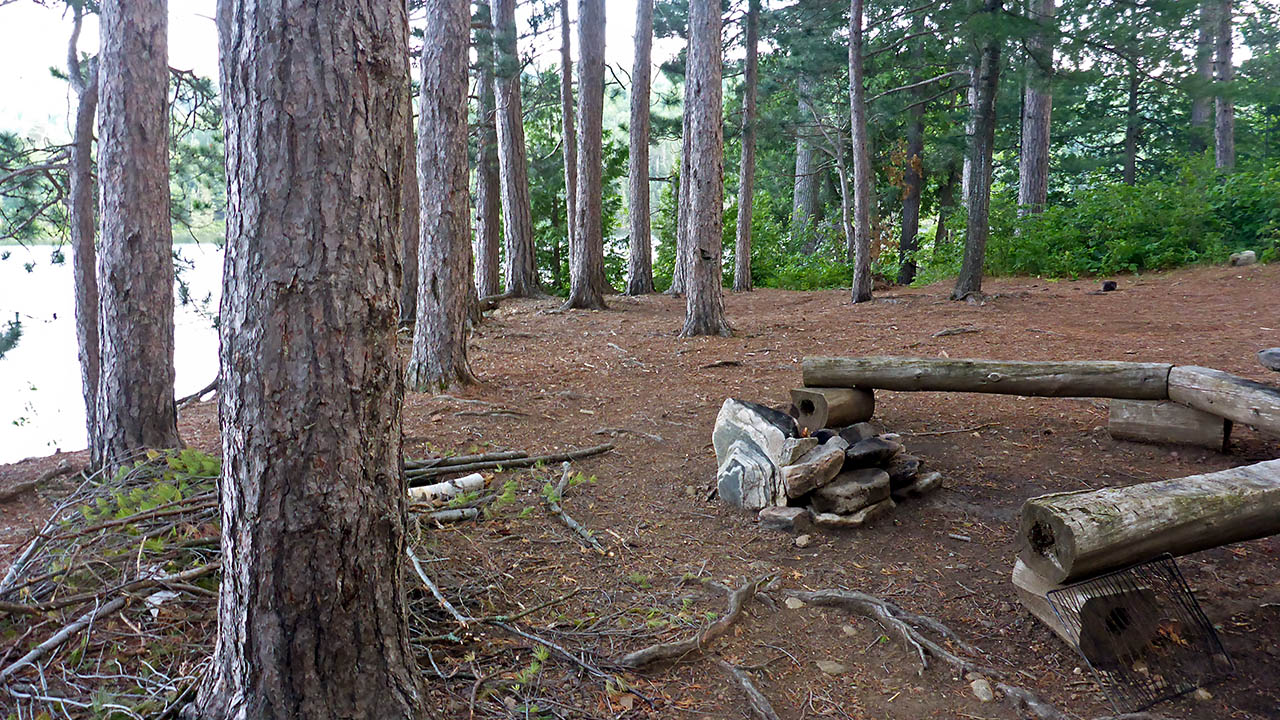 Campsite Campsite maintenance: Regular. Size of open area: 10m x 10m. Extent of tree cover: 70%. Degree of levelness: Very level. Number of level tent sites: 3+. North exposure: Trees. East exposure: Trees. South exposure: Trees. West exposure: View of lake. General description: Very flat and level site. A nice firepit that is open to wind from the west. A well protected site that feels quite "open" because of the mature stand of pines it is located in. Can accommodate 3 tents easily. Overall accessibility: Other than a steep rise from the water to the site proper, no accessibility issues.