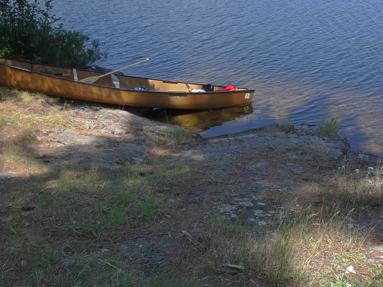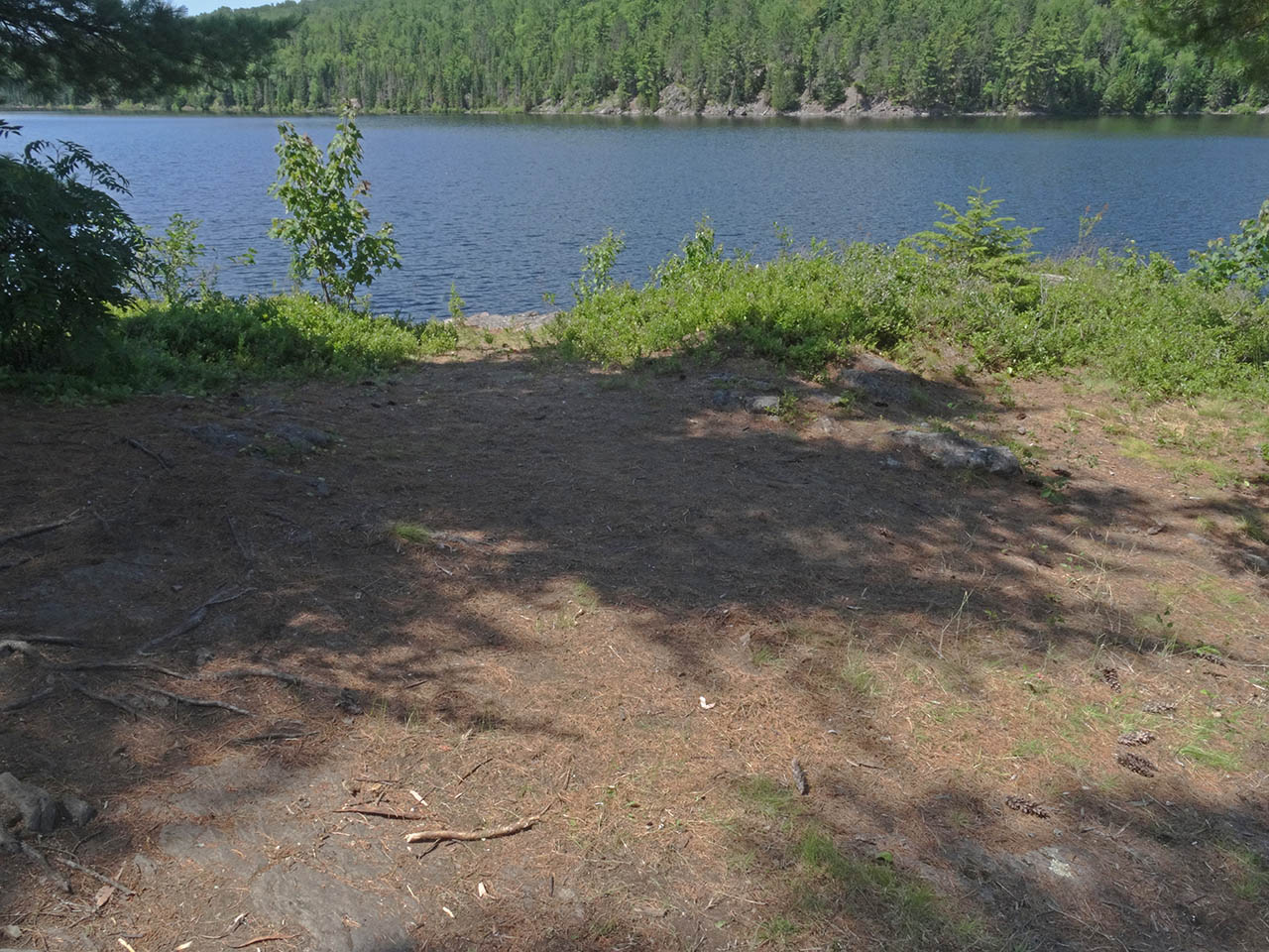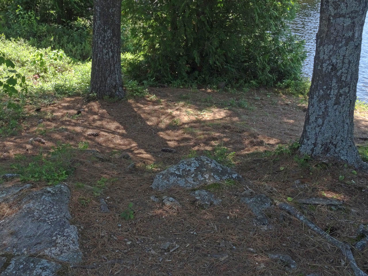 Landing Topography of under-water approach: An underwater rock shelf extends from the point's east shore. Impediments to disembarking from and/or unloading a canoe: Depending on water levels, care required for in-water unloading. Topography to tent sites: Slight slope across rock to campsite. Campsite from the water, as seen approaching from the west ... A shallow rock shelf provides this landing on the east side of the campsite's point ... Campsite maintenance: regular. Size of open area: 50' x 60'. Extent of tree cover: Only three large pine trees. Degree of levelness: Slight slopes between level areas. Number of level tent sites: Two. At a slight distance west of the firepit is a small tentsite under two large trees. To the north is a larger tentsite between two trees, but totally open to the overhead and winds. North exposure: Open. East exposure: Open. South exposure: Slight protection by some trees and distant topography. West exposure: Open. Firepit area is somewhat protected from the south by some trees ... A small tentsite is located behind the firepit area ... A nearby second larger tentsite is much more exposed to the north and west ... General description: An open campsite, subject to the west, north and east winds .. with great views of sunrise and sunset .. and bug clearing wind. The tentsites could be provided with some protection by tarps hung between the two overhead and adjacent trees. Overall accessibility: Good accessibility, once landing is achieved. View from the firepit area, looking east down the lake ... View across the larger tentsite, looking north across the lake ... ![]() Thanks to Jeffrey McMurtrie of Jeff'sMap for supplying the base-layer map component by Creative Commons licensing. Submitted by Barry Bridgeford .. Visited July, 2015 .. Submission August 23, 2015 |