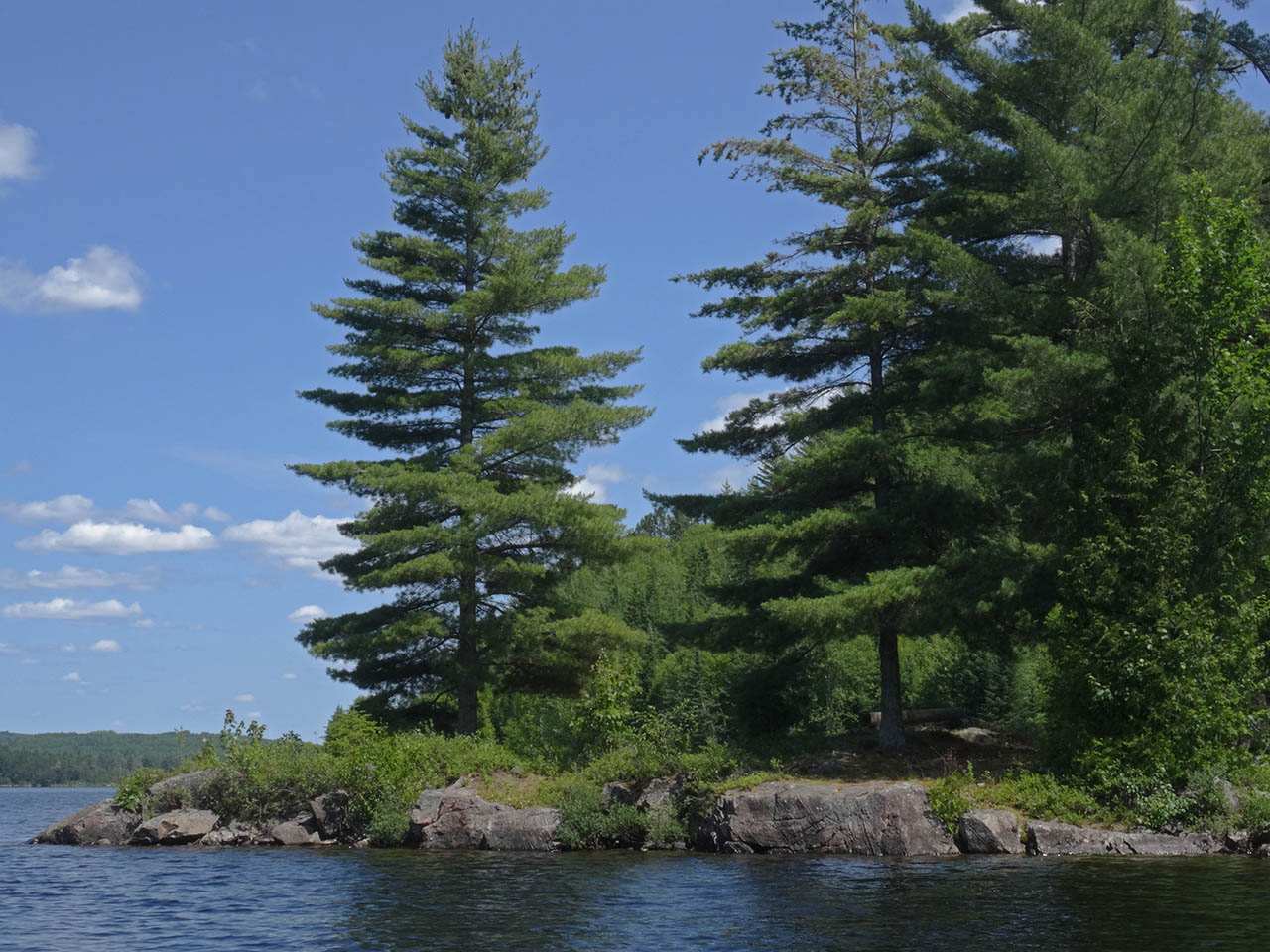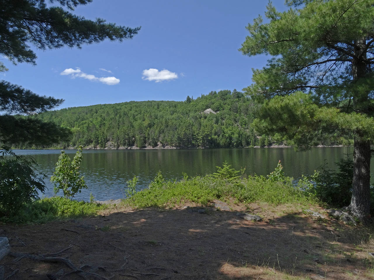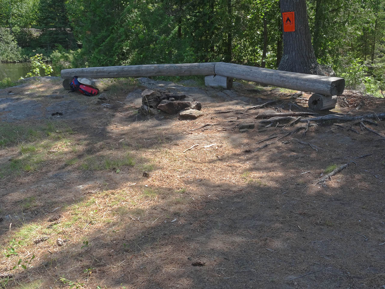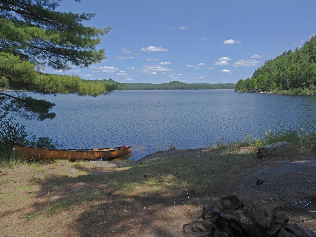 Landing Topography of under-water approach: An underwater rock shelf extends from the point's east shore. Impediments to disembarking from and/or unloading a canoe: Depending on water levels, care required for in-water unloading. Topography to tent sites: Slight slope across rock to campsite. Campsite from the water, as seen approaching from the west ... A shallow rock shelf provides this landing on the east side of the campsite's point ... Campsite maintenance: regular. Size of open area: 50' x 60'. Extent of tree cover: Only three large pine trees. Degree of levelness: Slight slopes between level areas. Number of level tent sites: Two. At a slight distance west of the firepit is a small tentsite under two large trees. To the north is a larger tentsite between two trees, but totally open to the overhead and winds. North exposure: Open. East exposure: Open. South exposure: Slight protection by some trees and distant topography. West exposure: Open. Firepit area is somewhat protected from the south by some trees ... A small tentsite is located behind the firepit area ... A nearby second larger tentsite is much more exposed to the north and west ... General description: An open campsite, subject to the west, north and east winds .. with great views of sunrise and sunset .. and bug clearing wind. The tentsites could be provided with some protection by tarps hung between the two overhead and adjacent trees. Overall accessibility: Good accessibility, once landing is achieved. View from the firepit area, looking east down the lake ... View across the larger tentsite, looking north across the lake ... ![]() Thanks to Jeffrey McMurtrie of Jeff'sMap for supplying the base-layer map component by Creative Commons licensing. Submitted by Barry Bridgeford .. Visited July, 2015 .. Submission August 23, 2015 |