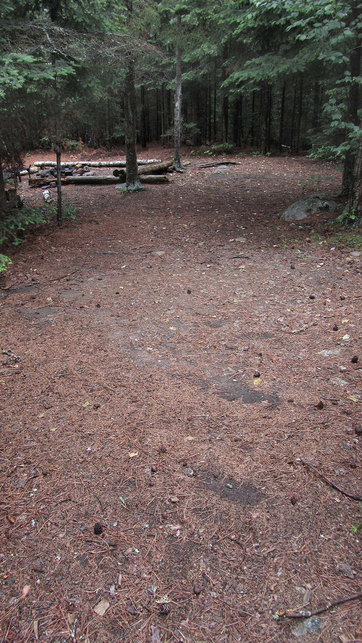 Landing Topography of under-water approach: Small sandy beach approaches from the south, tucked around behind rock face on campsite's west side. Impediments to disembarking from and/or unloading a canoe: Very narrow area open between the trees which come close to the water. Topography to tent sites: Considerable narrow trail climbs amidst the trees to the campsite. One has to approach from the south through the waterweeds to a small clearing amidst the shore's trees ... The narrow confines of the landing would make unloading multiple canoes a bit awkward ... While unloading isn't difficult, stowing more than one canoe onshore could be ... The climb to the campsite is this narrow slippery trail (looking down) amidst the trees ... Campsite Campsite maintenance: regular Size of open area: Small and confined. Extent of tree cover: Substantial overhang and shade all around the campsite. Degree of levelness: Firepit and tentsite areas are level. Number of level tent sites: Tentsite areas for three medium-sized tents. North exposure: Solid trees block the north wind. East exposure: Solid trees block the east wind.. South exposure: Numerous trees block both the south wind and any view. West exposure: A substantial line of trees block the view. A small gap in the trees and rock ledge due west of the firepit provides a view to the west. The first tentsite is between the top of the trail and the firepit ... The second tentsite is immediately north of the firepit and the third is beyond it ... General description: This campsite is surrounded and shaded by trees, to the point of being dismal and 'buggy'. The overgrowth of the trees and the state of the firepit benches indicate that it gets little use and/or maintenance. I suggest that the state of the thunderbox be checked before committing to using this campsite. Overall accessibility: The confined nature of the landing and the long grade of the trail to the campsite are both negative accessibility issues. This campsite could serve as a one-night stopover in a pinch. However, it wouldn't make a good destination campsite. Nor is it good for travelling with young children or "sun-worshippers". This view is to the northwest, from a rock ledge between two pines west of the firepit ... This view is from a small clearing part way up the trail to the campsite, looking west ...