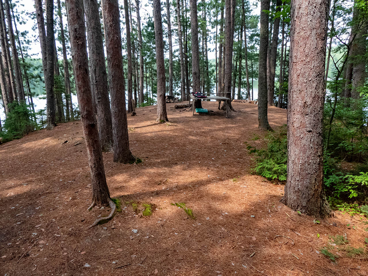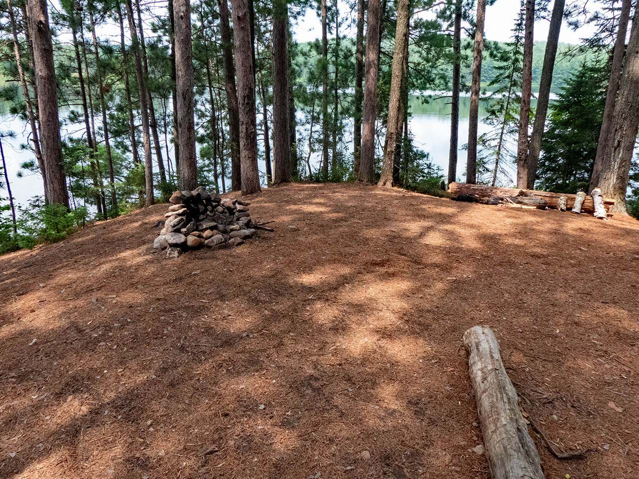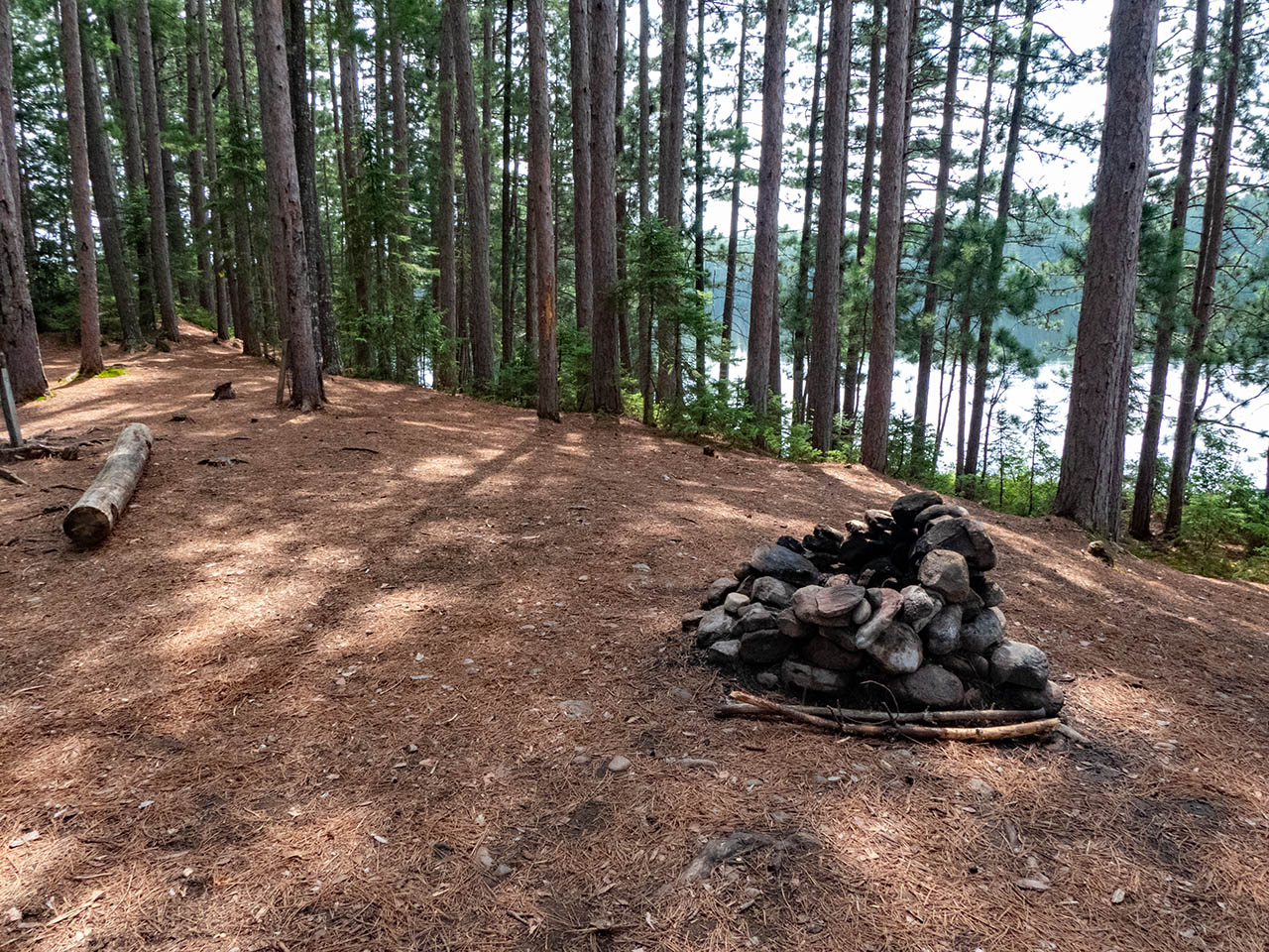 Campsite Campsite maintenance: Regular. Size of open area: A rounded area provides three or four opportunities to pitch tents under the tall pines, relatively close to each other and to the firepit, in an area of approximately 15 x 60 feet. Extent of tree cover: Tree canopy is provided by mature pines, with their lower halves being somewhat open to the lake below. Degree of levelness: The campsite is located on a somewhat rounded height, with a narrow level section running north-south down its middle. Number of level tent sites: The southmost part has room for 2 level tentsites. Since the rest of the campsite is rounded, additional tents are forced close to the central firepit area. North exposure: Line of trees provides broken view of the lake. East exposure: Trees. South exposure: Trees. West exposure: Trees break the view of the lake. General description: Private campsite on a raised point with a tree-filtered sunset view. Overall accessibility: Pronounced grade requires fair bit of up-and-down walking to-and-from the water.