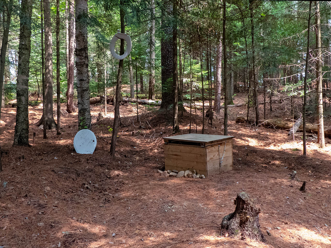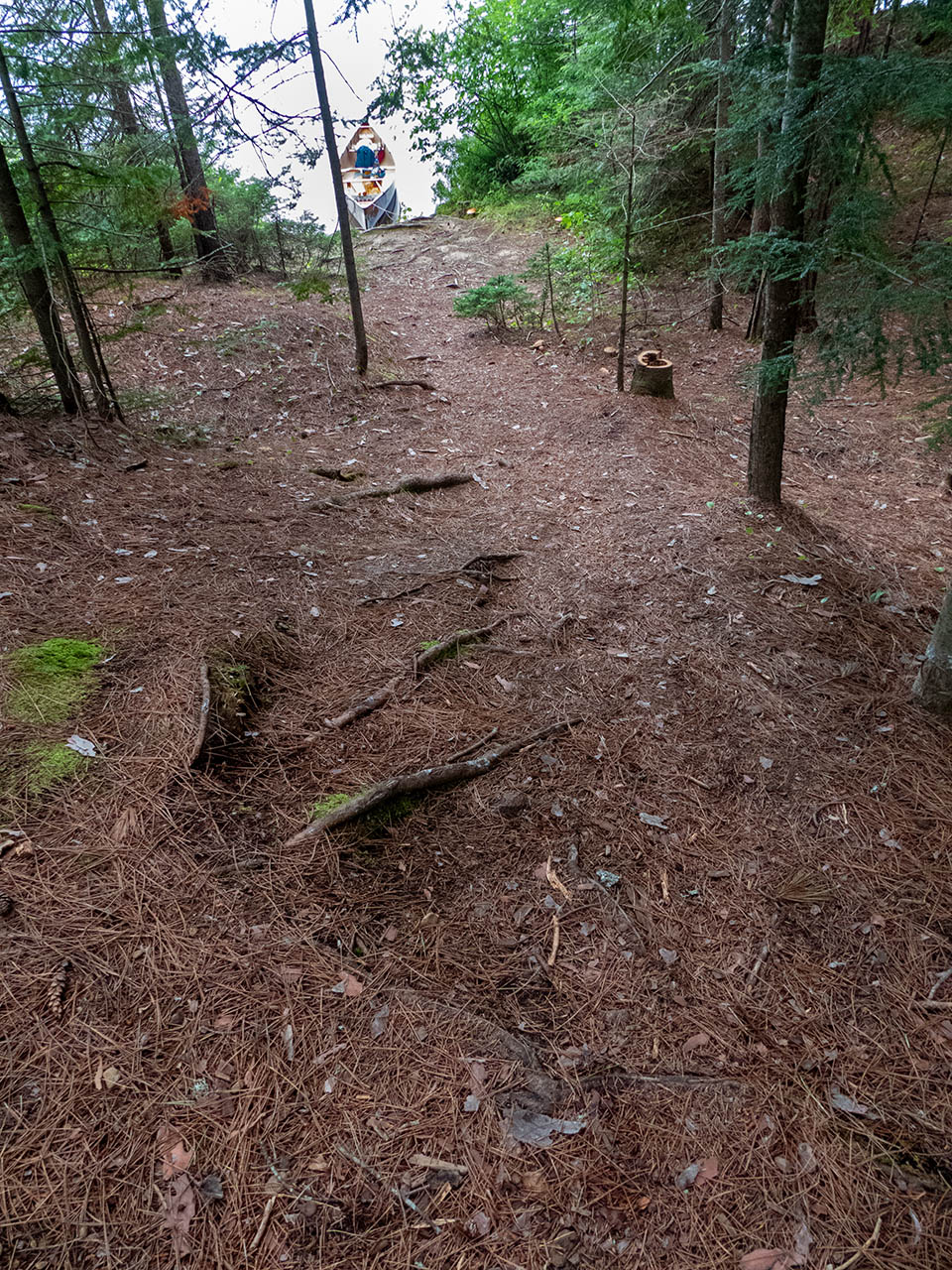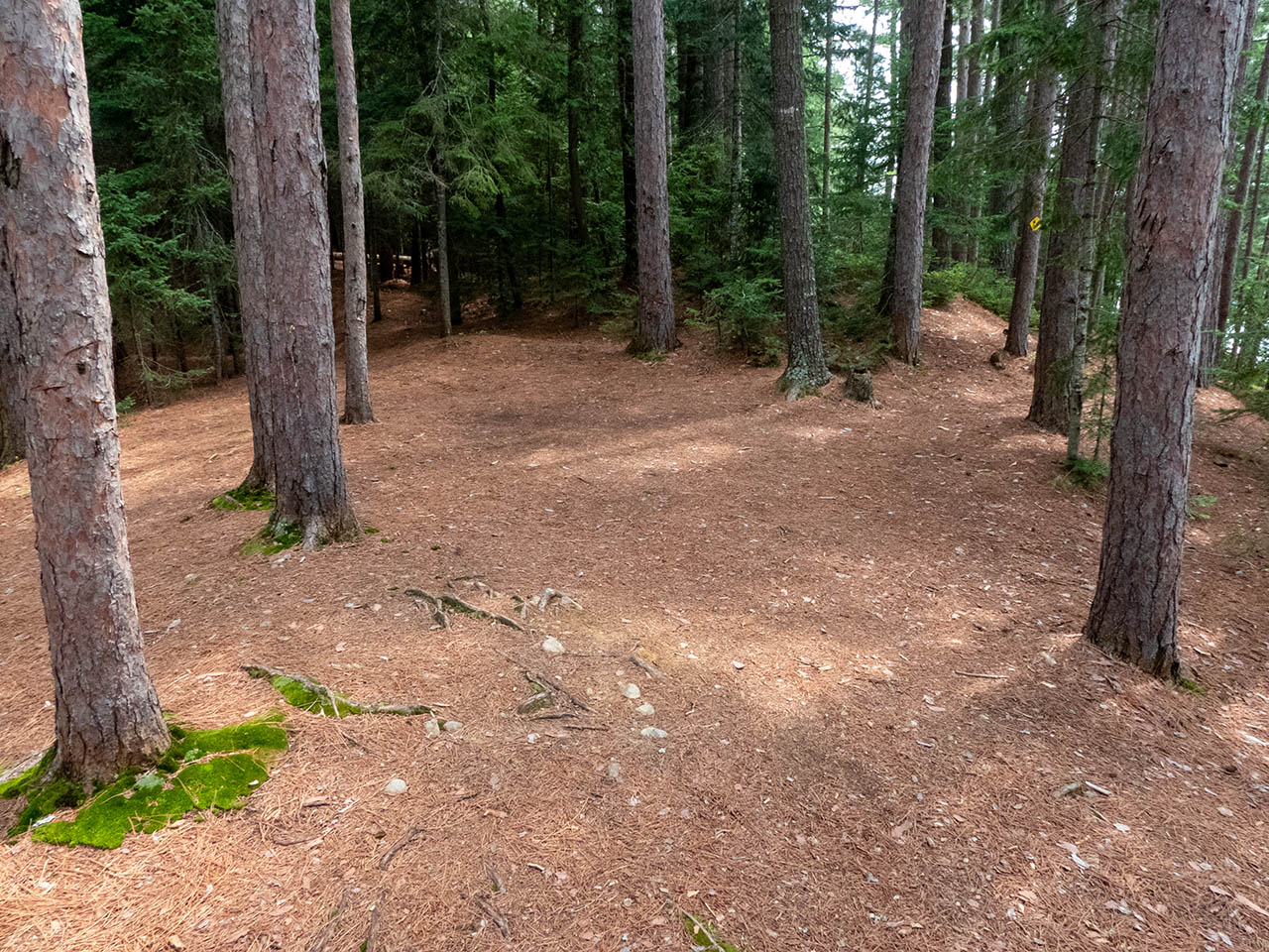 Campsite Campsite maintenance: Regular. Size of open area: A rounded area provides three or four opportunities to pitch tents under the tall pines, relatively close to each other and to the firepit, in an area of approximately 15 x 60 feet. Extent of tree cover: Tree canopy is provided by mature pines, with their lower halves being somewhat open to the lake below. Degree of levelness: The campsite is located on a somewhat rounded height, with a narrow level section running north-south down its middle. Number of level tent sites: The southmost part has room for 2 level tentsites. Since the rest of the campsite is rounded, additional tents are forced close to the central firepit area. North exposure: Line of trees provides broken view of the lake. East exposure: Trees. South exposure: Trees. West exposure: Trees break the view of the lake. General description: Private campsite on a raised point with a tree-filtered sunset view. Overall accessibility: Pronounced grade requires fair bit of up-and-down walking to-and-from the water.