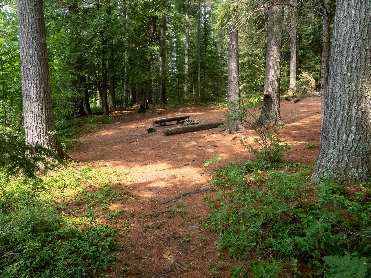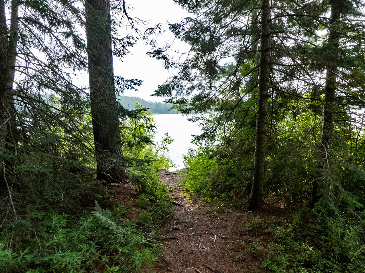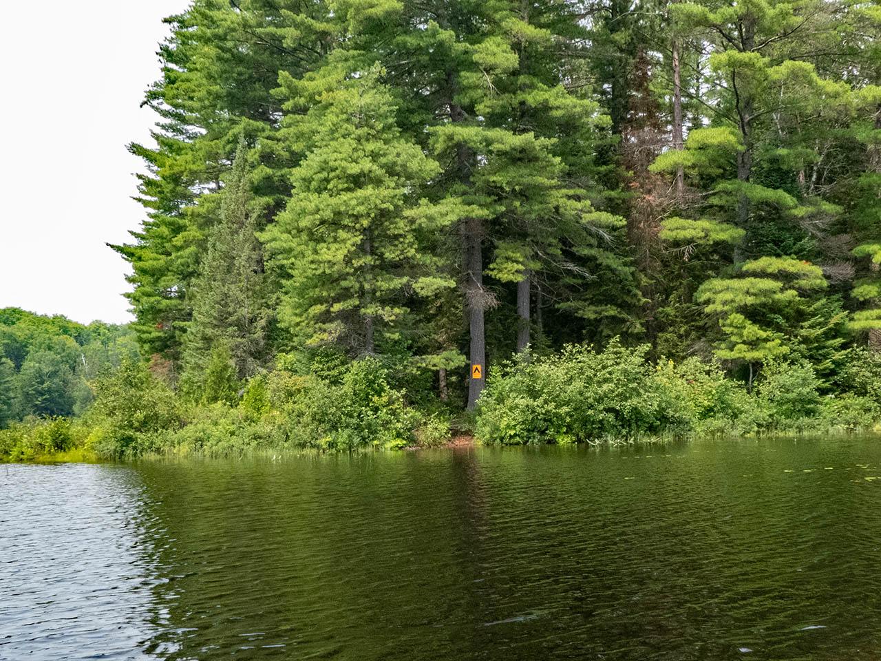 Landing Topography of under-water approach: Very small gravel beach. Impediments to disembarking from and/or unloading a canoe: Very narrow opening in the shoreline vegetation. Topography to tent sites: Just a couple of "root-steps".