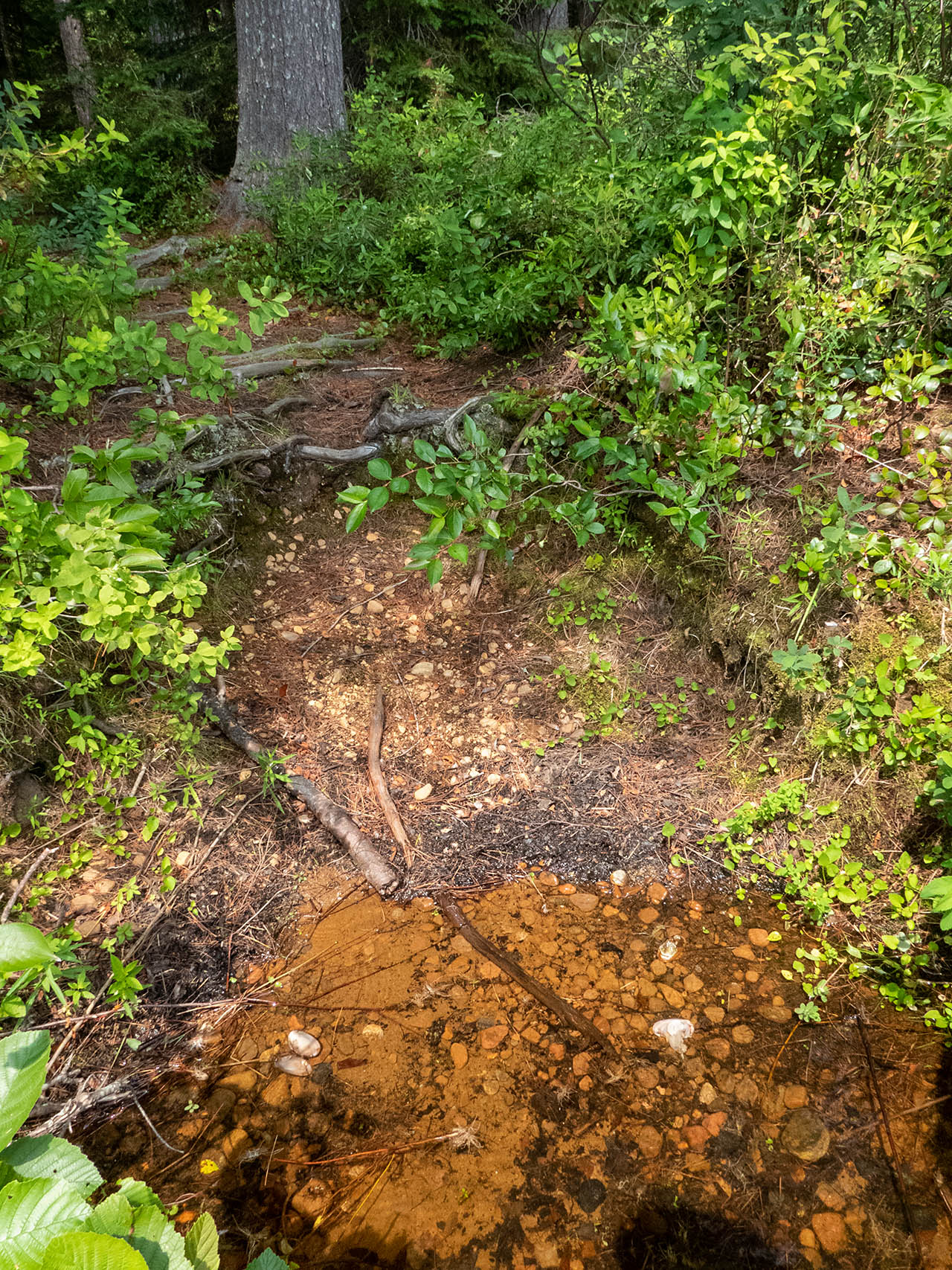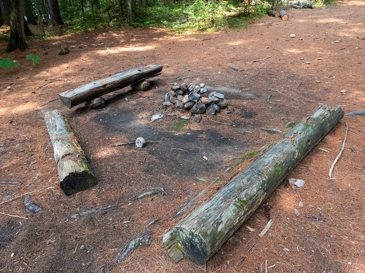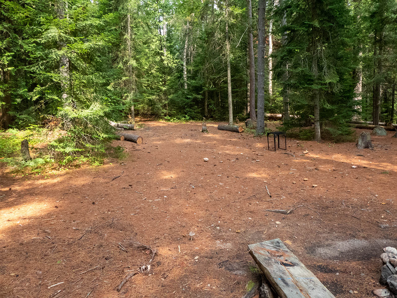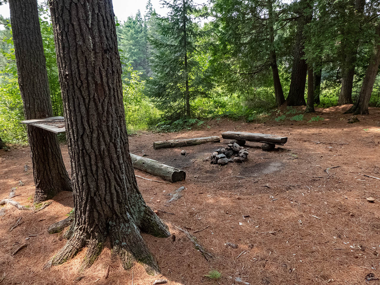 Landing Topography of under-water approach: Very small gravel beach. Impediments to disembarking from and/or unloading a canoe: Very narrow opening in the shoreline vegetation. Topography to tent sites: Just a couple of "root-steps".