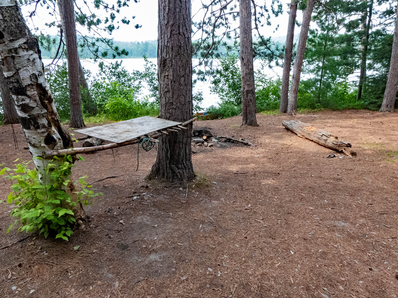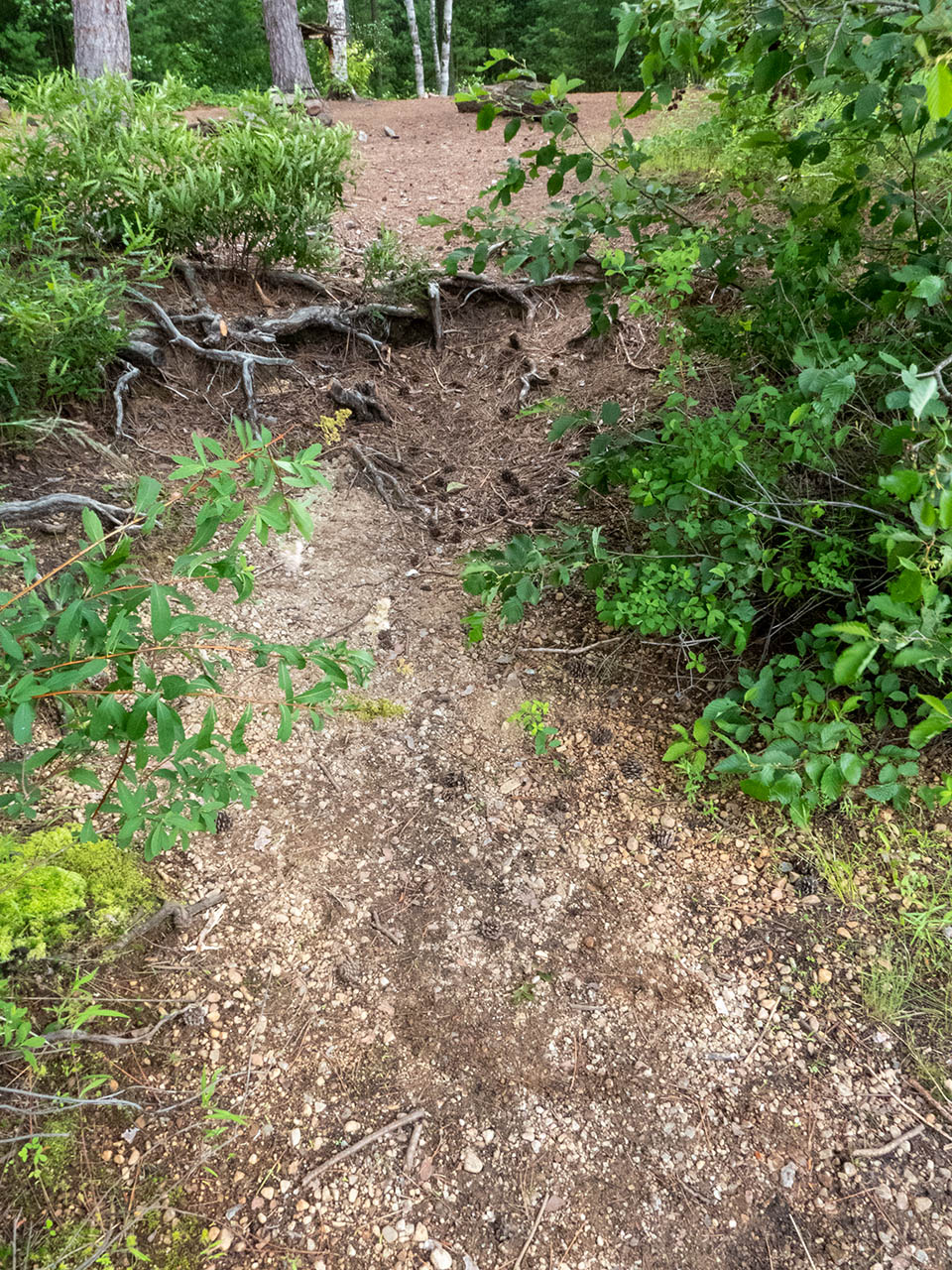 Landing Topography of under-water approach: Sand and gravel beach-like slope. Impediments to disembarking from and/or unloading a canoe: Nearby shrubs confine the landing. Topography to tent sites: Loose gravel rise.