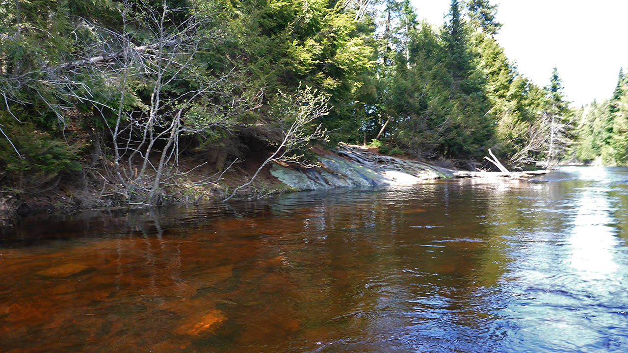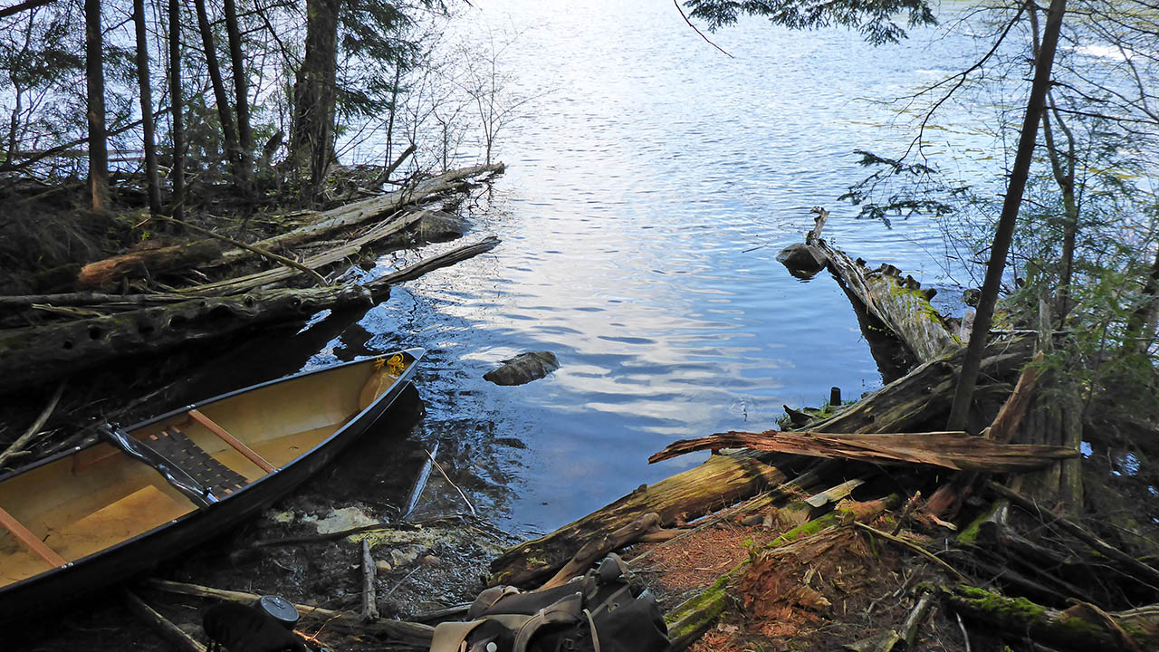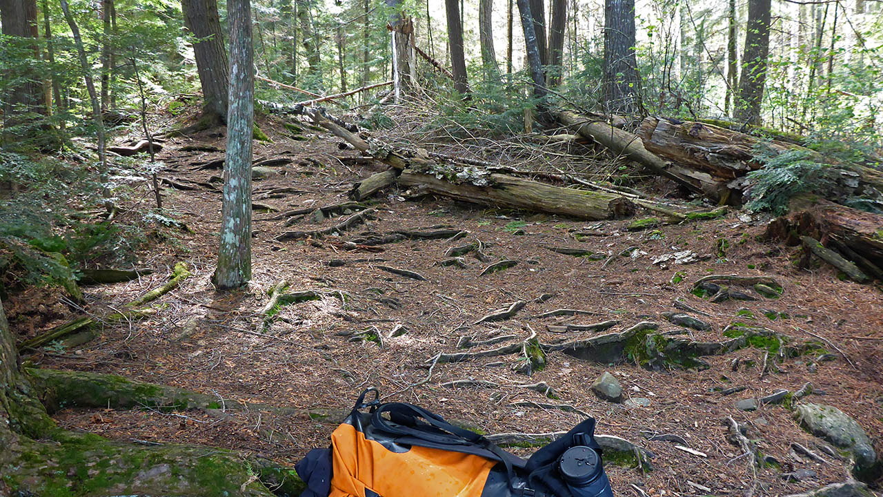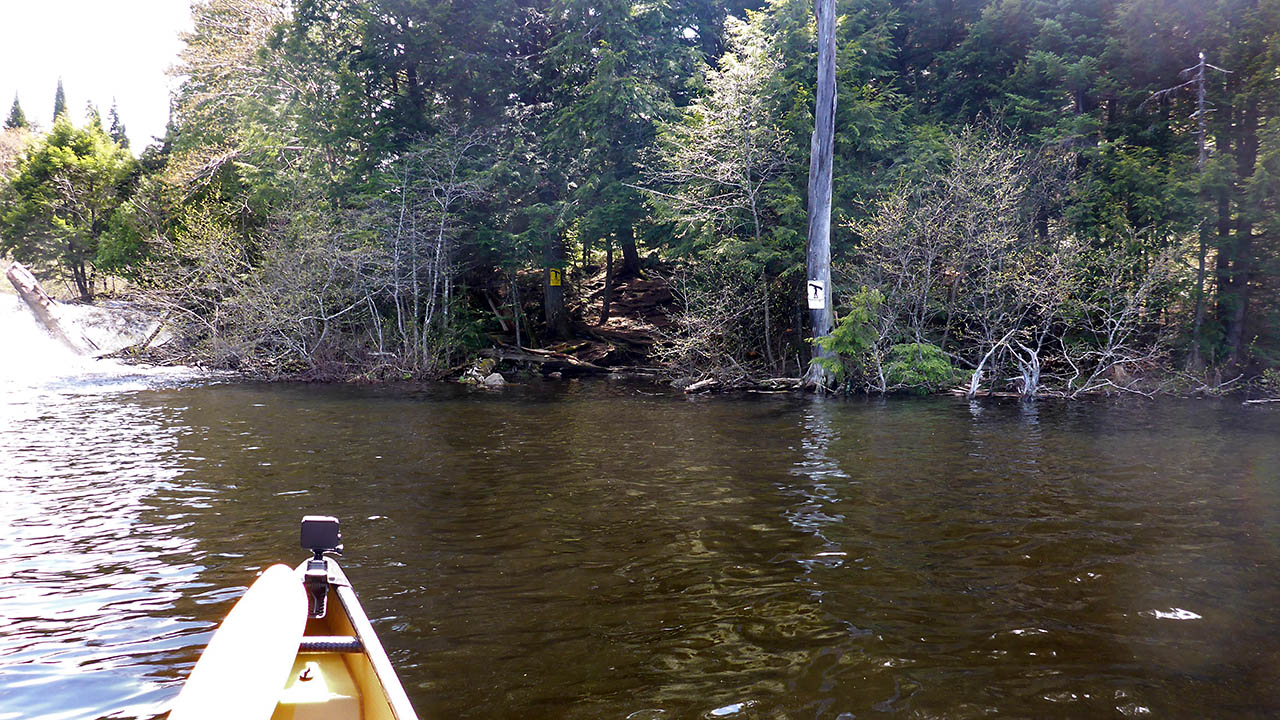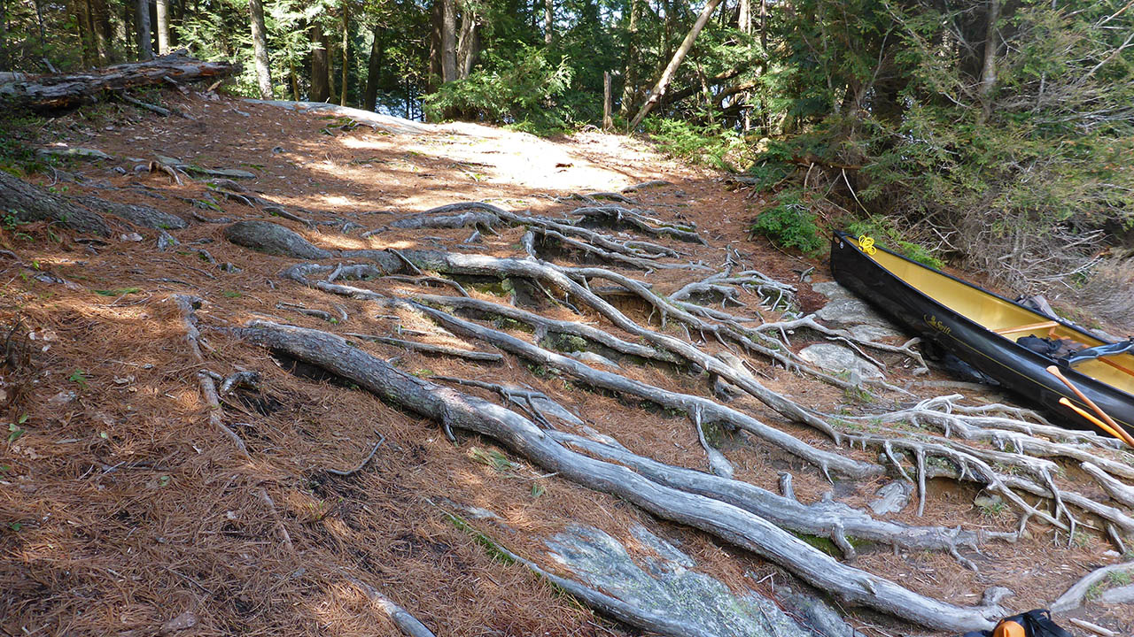 Length of portage: 50 meters (signed 90 meters). Portage maintenance regular or low: Regular. Landing on Hornbeam downstream of Twin Falls (elevation 366m) Topography of under-water approach: Mud and silt. Impediments to disembarking from and/or unloading a canoe: Small landingarea that seems to collect various impediments. Topography of the ascending grade: A short, steep climb that is quite rooty. Impediments to moving gear to portage trail: None. Approaching the landing ...![]() ![]() ![]() Portage Trail (peak elevation 369m) General description: Signed at 90m, Jeff's Map says 50m. It feels closer to 25m. It isn't worth putting on backpacks to make this portage. It's that sort! Topographical impediments to traveling: Both ends of the trail require some caution due to the incline and presence of roots. Landing on Hornbeam Lake - upstream (elevation 368 meters). Topography of under-water approach: Large slab of rock with a significant slope. Impediments to disembarking from and/or unloading a canoe: Landing area is a large rock with a significant slope that can be slippery when wet. Topography of the ascending grade: The rock is the ascending grade with large roots at the top. Impediments to moving gear to portage trail: Large roots "defend" the start of the trail. Large roots at the top of the trail ...![]() ![]() ![]()