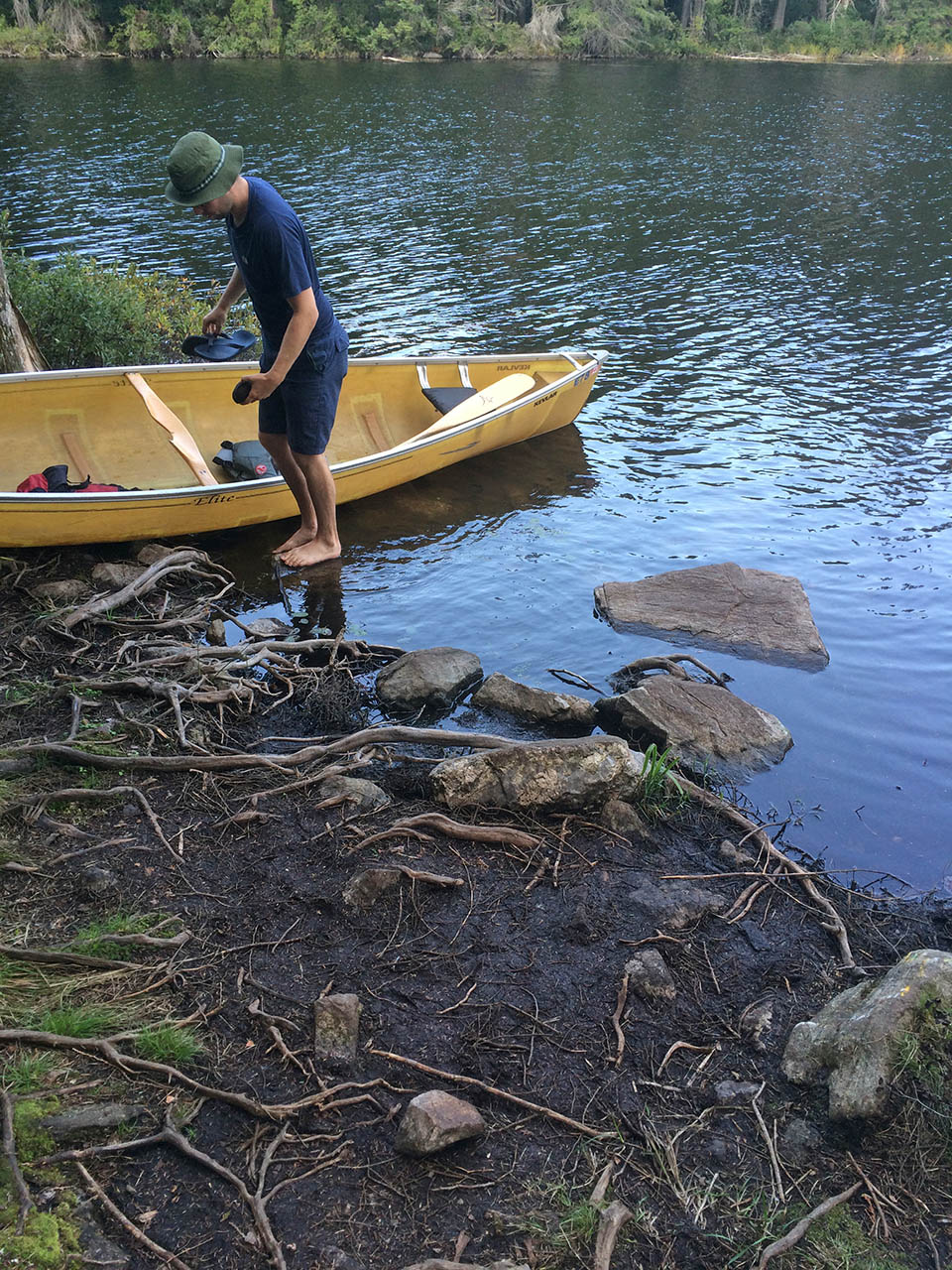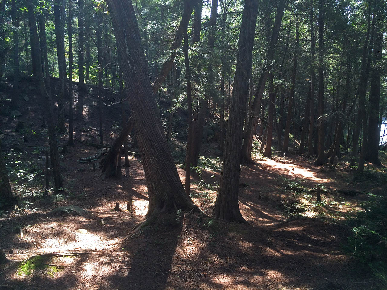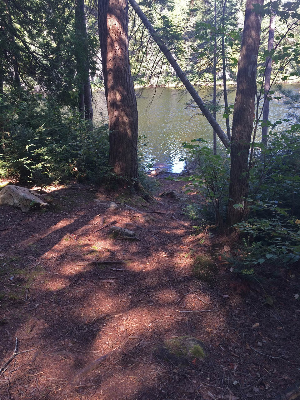 Landing Landing Topography of under-water approach: Shallow, mucky bottom with some large rocks to avoid. Impediments to disembarking from and/or unloading a canoe: Some underwater rocks to maneuver around but nothing too difficult. Could easily pull up and unload two canoes. Topography leading to tent sites: Moderately sloped uphill trail leads to site. Watch out for rocks and roots.