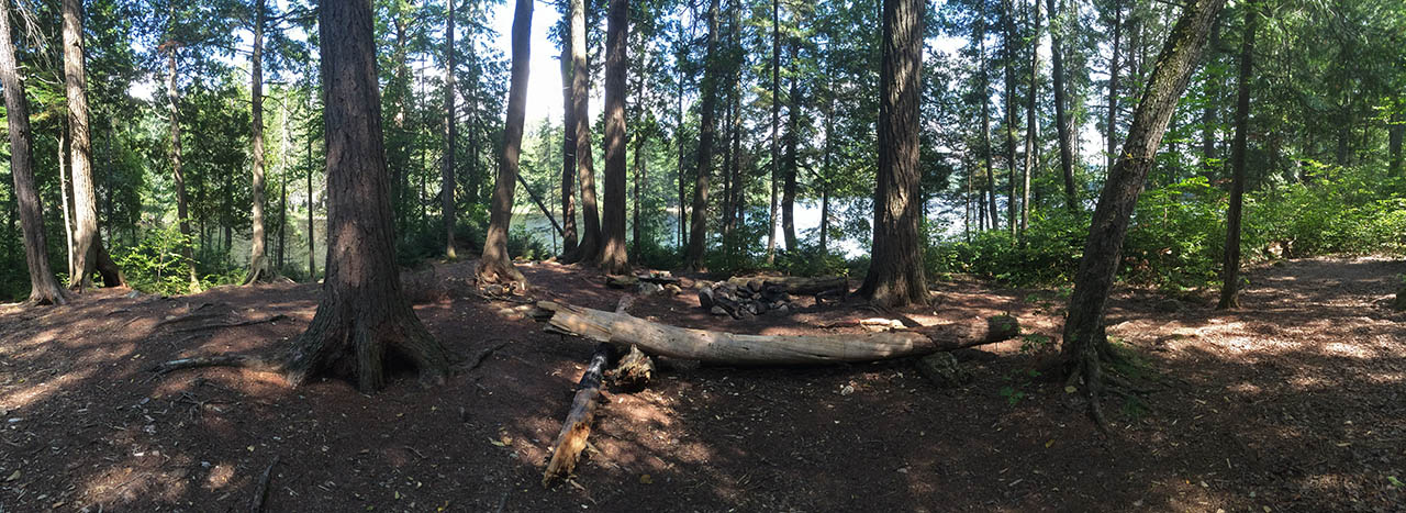 Campsite Regular or low-maintenance: Regular Size of open ground area: Large site with lots of space to spread out. Extent of tree cover: 100% This site is set back from the lake and very treed Degree of levelness: Quite level on the main portion of the site. Significant slope up from the water and there is a lower level area behind the main site where more tent pads could be found. Number of tent sites: Many areas available for small tents. One clearly defined area where a larger tent would fit well. North exposure: View of lake through the trees. East exposure: Protected by forest. South exposure: Protected by forest. West exposure: Protected by forest.