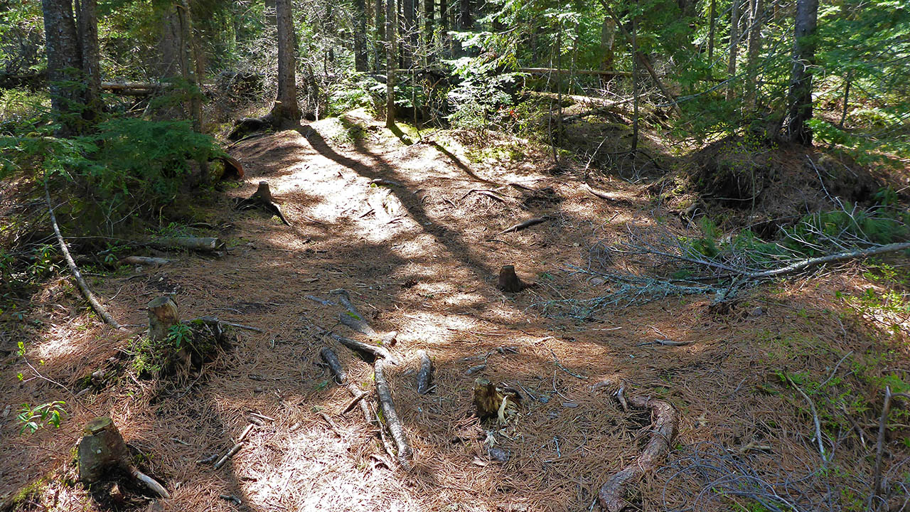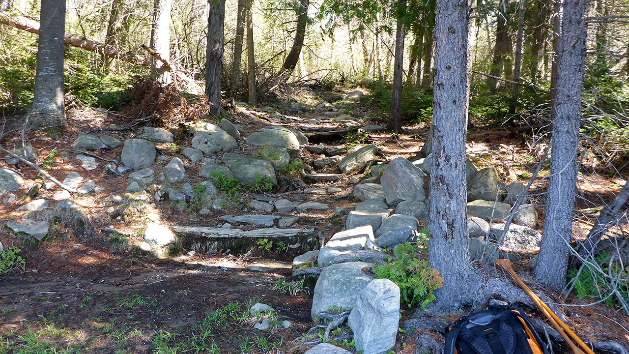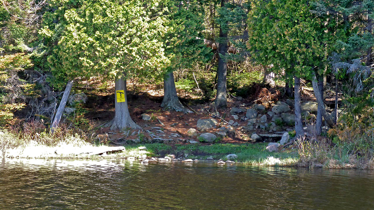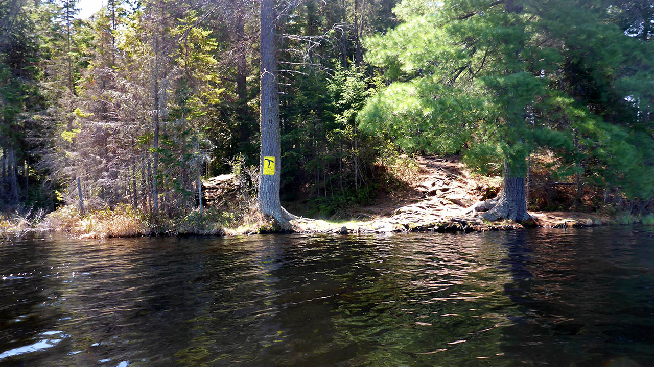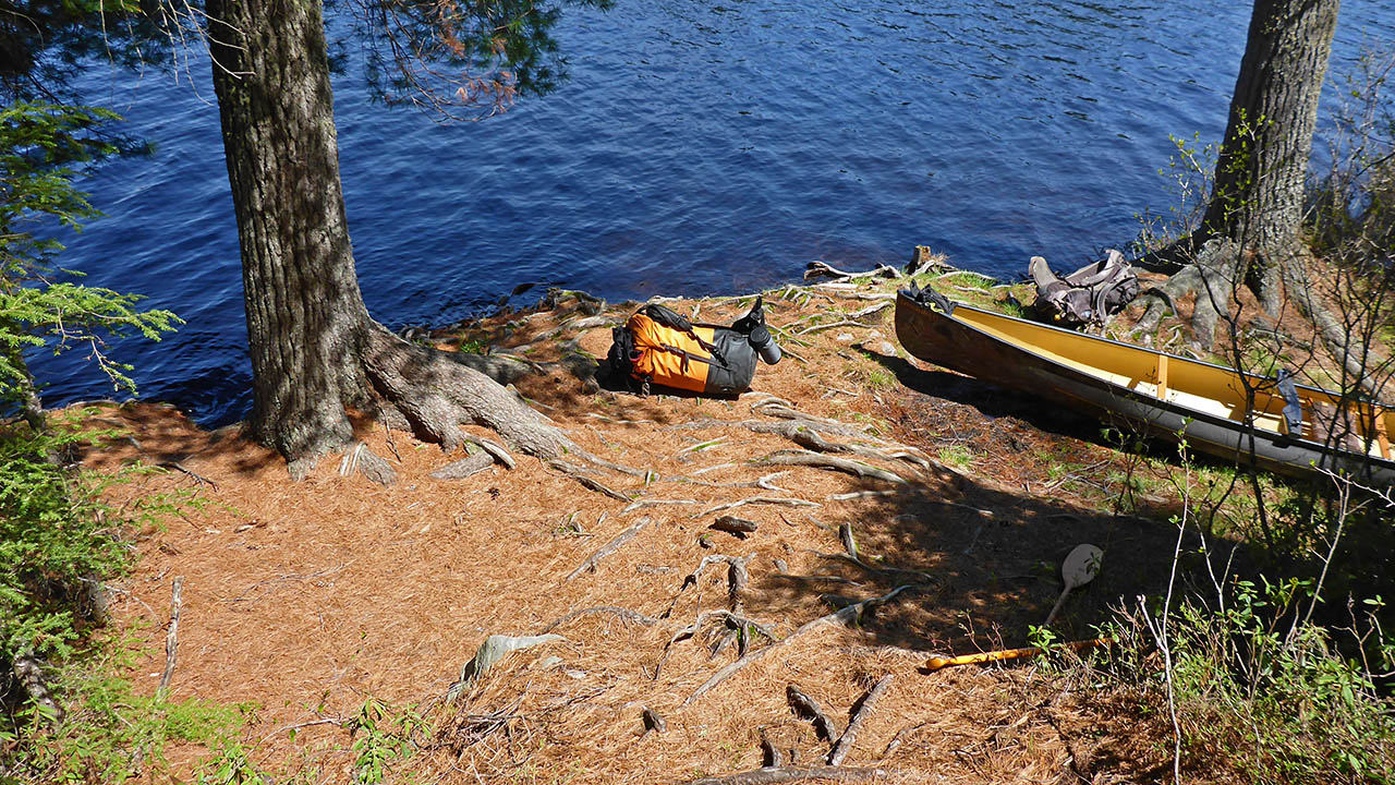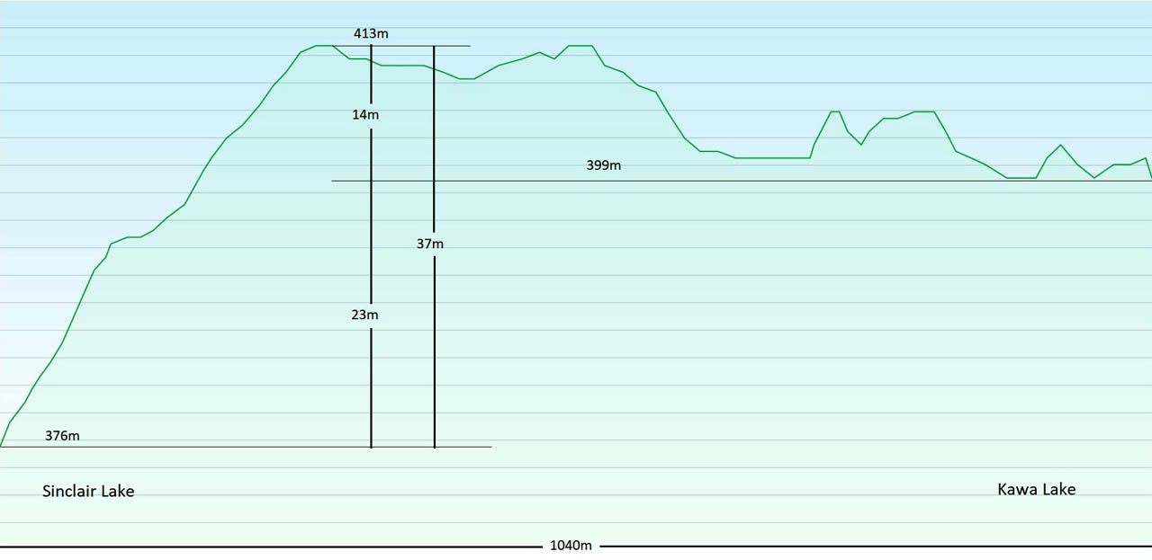 Length of portage: 1040 meters. Portage maintenance regular or low: Regular. Landing on Sinclair Lake (elevation 376m) Topography of under-water approach: Shallow water, small rock, sand and silt. Impediments to disembarking from and/or unloading a canoe: No issues. Can accomodate 2 canoes and gear. More canoes are crowded. Topography of the ascending grade: Very rocky to start. A rock staircase leads away from the landing. Impediments to moving gear to portage trail: None. Trail begins immediately at the landing. Trail is at the right side ...![]() ![]() Portage Trail (peak elevation 413m) Elevation profile ...![]() Landing at Kawa Lake (elevation 399 meters). Topography of under-water approach: Small/medium size rocks. Knee deep water with a fairly quick drop-off. Impediments to disembarking from and/or unloading a canoe: Roots line the shore, but no impediments. Topography of the ascending grade: Path is rocky and rooty. Impediments to moving gear to portage trail: A small area next to the landing can be used to stage gear prior to portaging. Small area that could be used for gear ...![]() ![]() ![]()