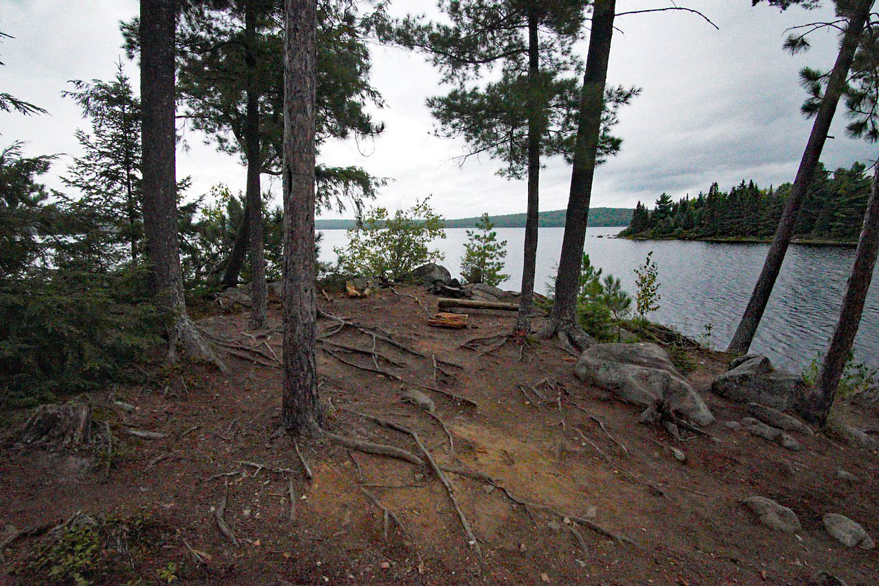Campsite Campsite maintenance: Regular. Size of open ground area: We didn't measure, but this is a large site with two levels and could accommodate a large group. The fire pit level slopes up from the water and is quite exposed. There are two separate fire pits. Extent of tree cover: The fire pit area is quite exposed. The tent sites are more sheltered. Degree of levelness: Not very level. The fire pit area is on a steep angle, and even the tent sites have some waves to them. We camped in hammocks and our backs don't have first hand experience, so I don't feel qualified to comment further. Number of level tent-sites: 3 - 4. North exposure: Open view of the lake. East exposure: Open view of the bay. South exposure: Trees. West exposure: Open view of the lake.