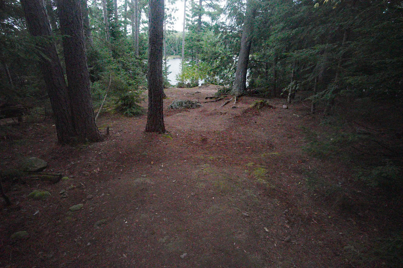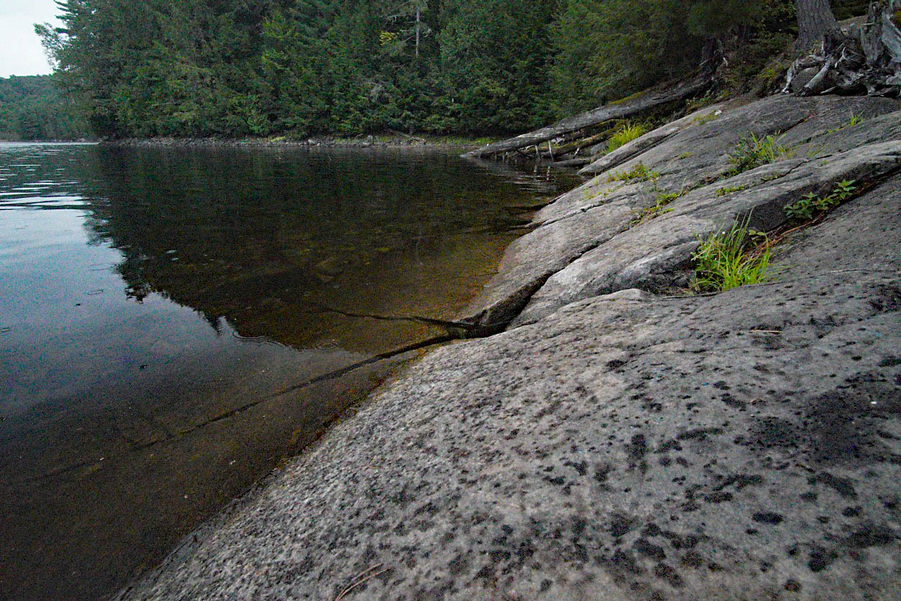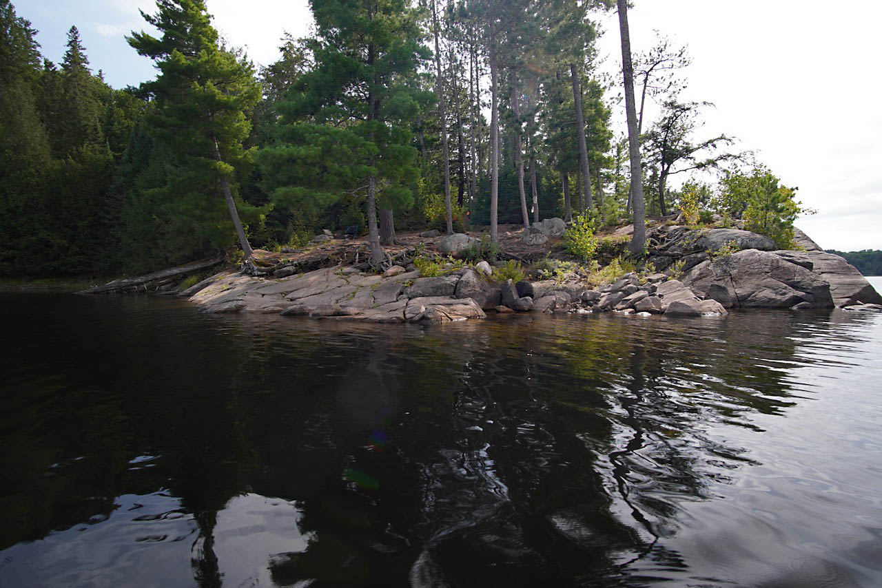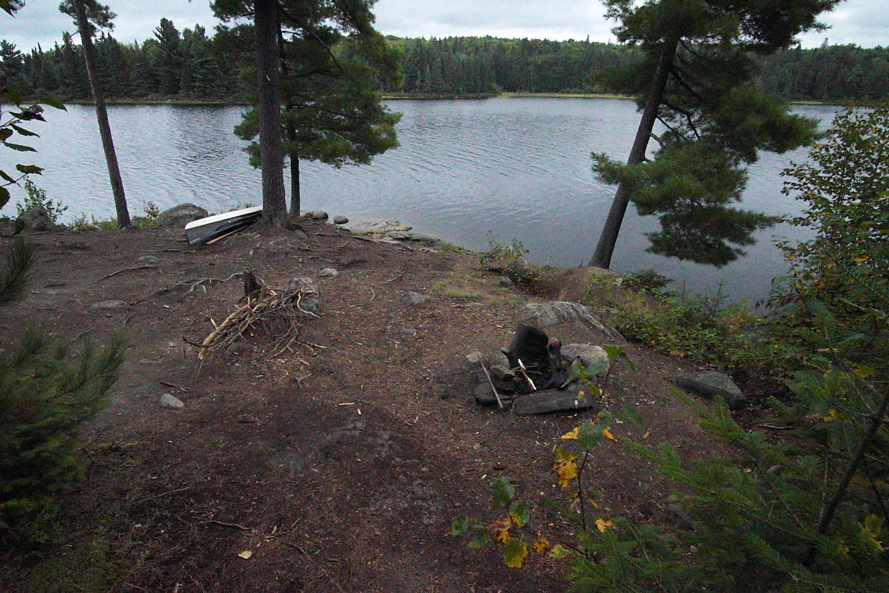 Landing Topography of under-water approach: Sloped rock shelf with smaller underwater rocks. Impediments to disembarking from and/or unloading a canoe: The rock shelf is on an angle, is slippery in places and drops off fairly quickly. Topography to tent sites: Significant slope up to the fire pit with big steps up over exposed tree roots.