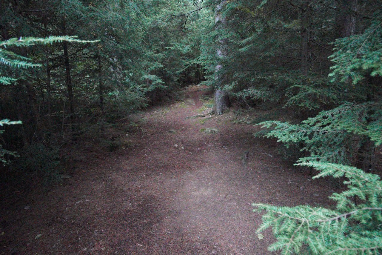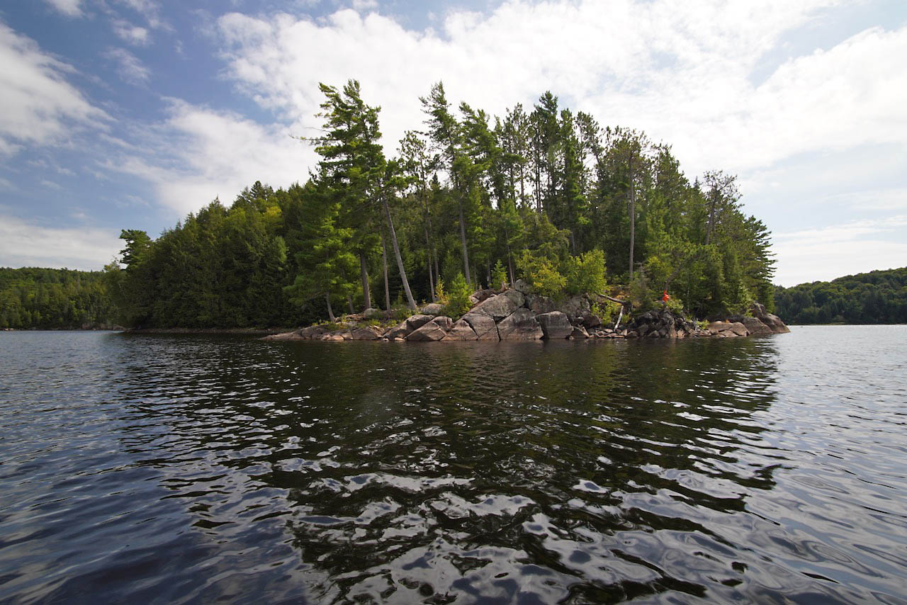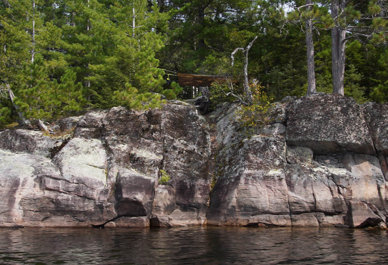 Landing Topography of under-water approach: Sloped rock shelf with smaller underwater rocks. Impediments to disembarking from and/or unloading a canoe: The rock shelf is on an angle, is slippery in places and drops off fairly quickly. Topography to tent sites: Significant slope up to the fire pit with big steps up over exposed tree roots.