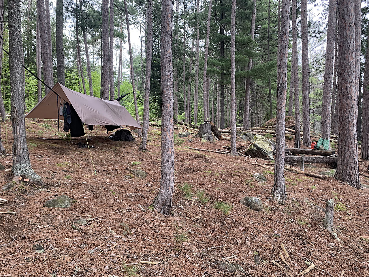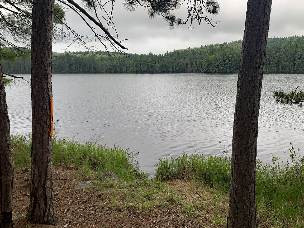 Landing Topography of under-water approach: Under water is soft swampy mud. Impediments to disembarking from and/or unloading a canoe: There is room for a few canoes/kayaks.. Topography leading to tent sites: Landing is a large grassy shore. View from the campsite and canoe landing ... Campsite Regular or low-maintenance: Regular.. Size of open ground area: Smaller campsite that is sloped, very rocky with deadfall found all over the campsite. Extent of tree cover: Most of tree cover is made up of small pine trees. Campsite would not be protected from southerly winds. Degree of levelness: Entire campsite is sloped and littered with downed trees. Topography to tent sites: Could not find any actual tent site. Could not find any place to setup a tent. It was difficult to find two trees to hang a hammock. Many of the trees were to small or to close together to hang a hammock. Number of level tent sites: 0. Small firepit and seating area, with no problem finding firewood ... Looking east toward the firepit ... Overall accessibility: Had to climb over deadfall to get to the thunderbox which is behind the campsite in thick bush.